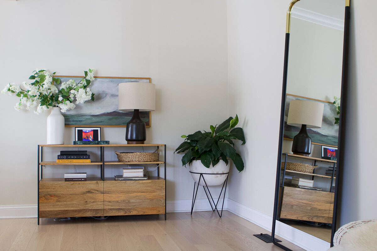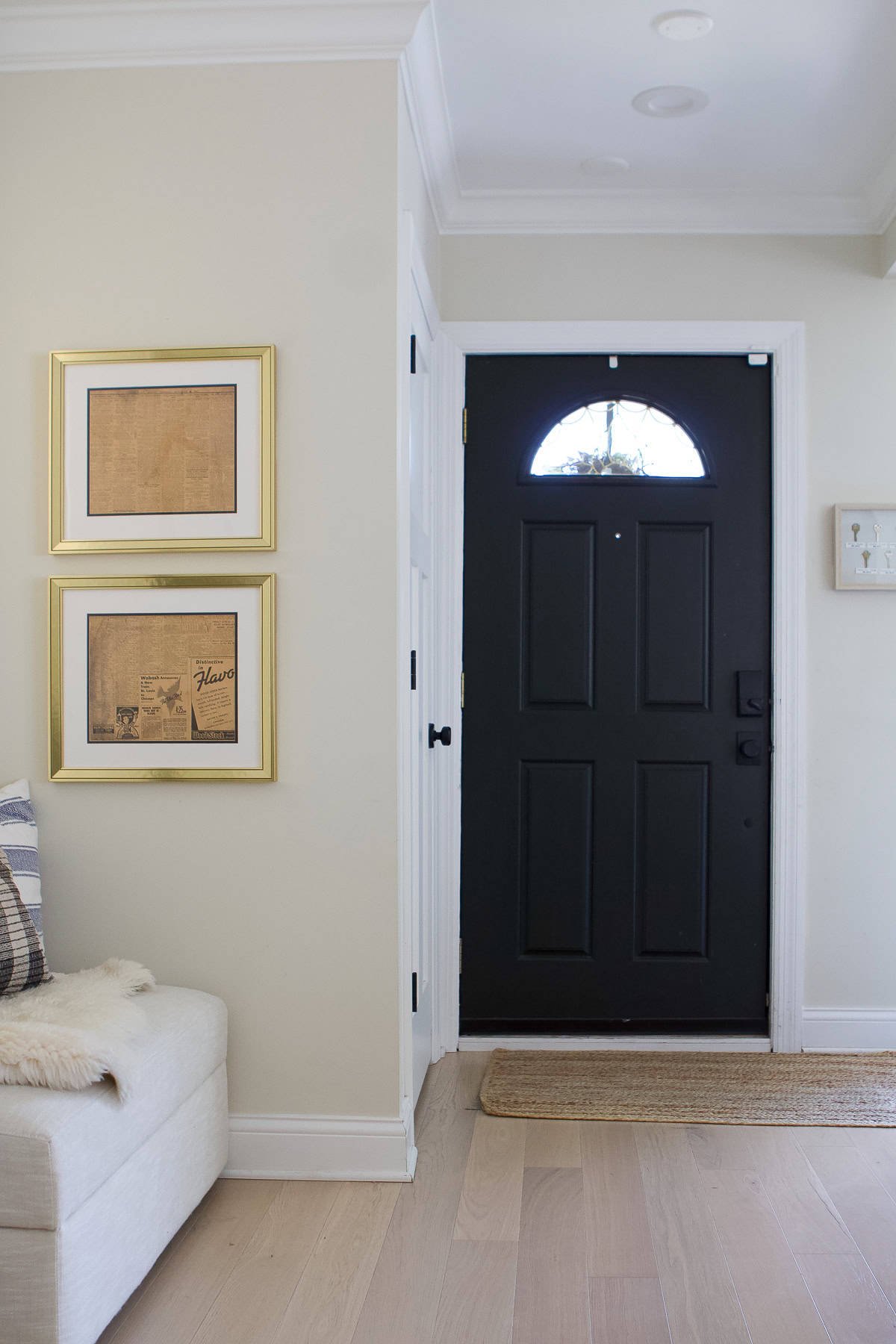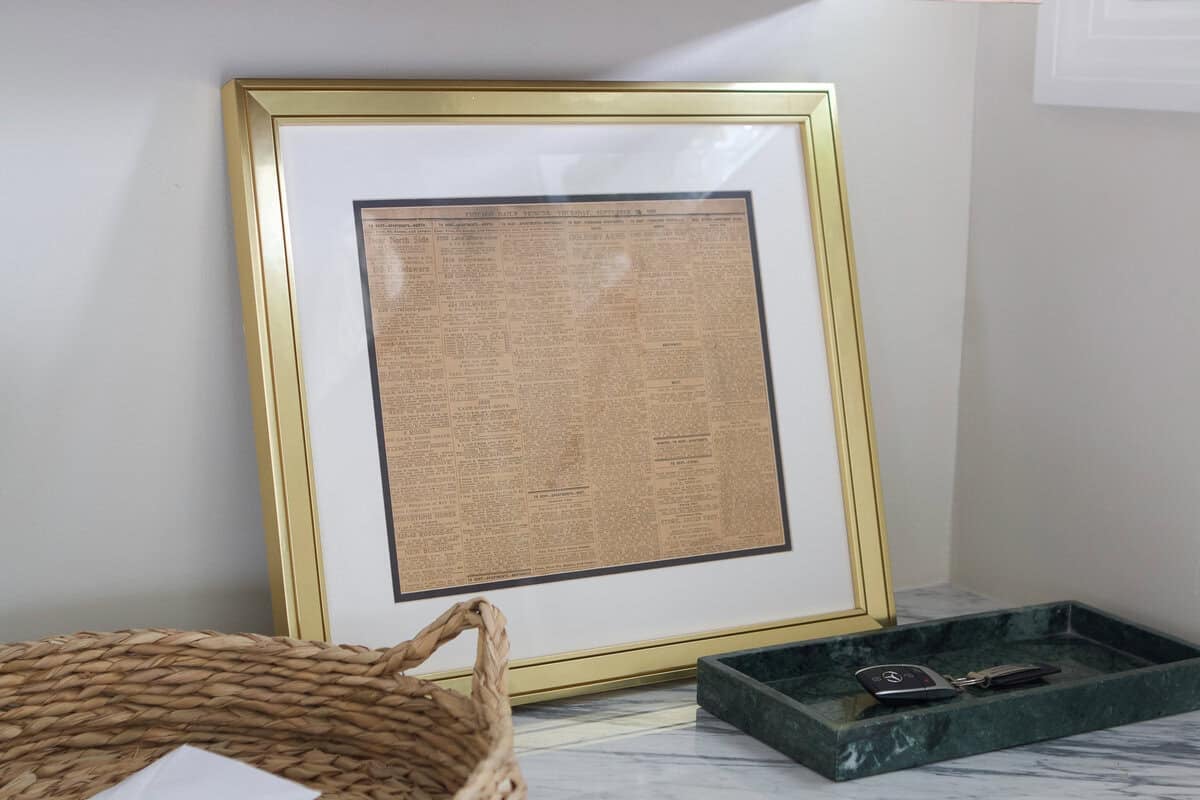 These shelves are the perfect spot for decorative accents, mail, and keys. Right now, I have a plant sitting on the marble windowsill, a framed family photo, and even a framed newspaper clipping that we discovered tucked into the walls during demo. I love showcasing a piece of our home’s history right when you walk in the door.