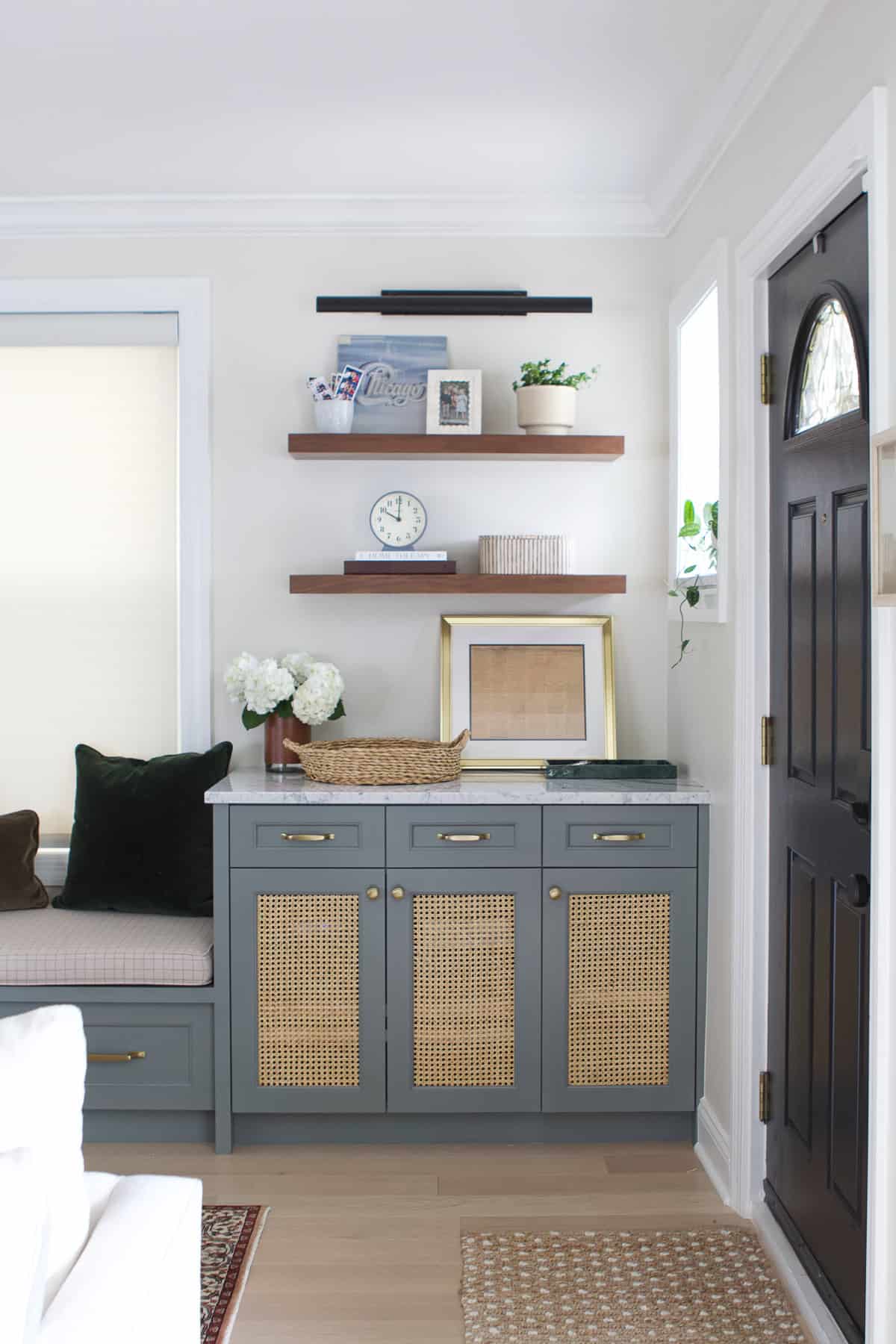 Beneath the marble, the cabinets are vented cane-front doors, which allow airflow while hiding all of our internet equipment, routers, and Sonos speakers. Before, these cords and boxes were piled into our old coat closet, and now theyโre neatly tucked away but still easy to access. Itโs such a huge improvement visually, and the cane adds warmth and texture to balance the painted cabinetry.