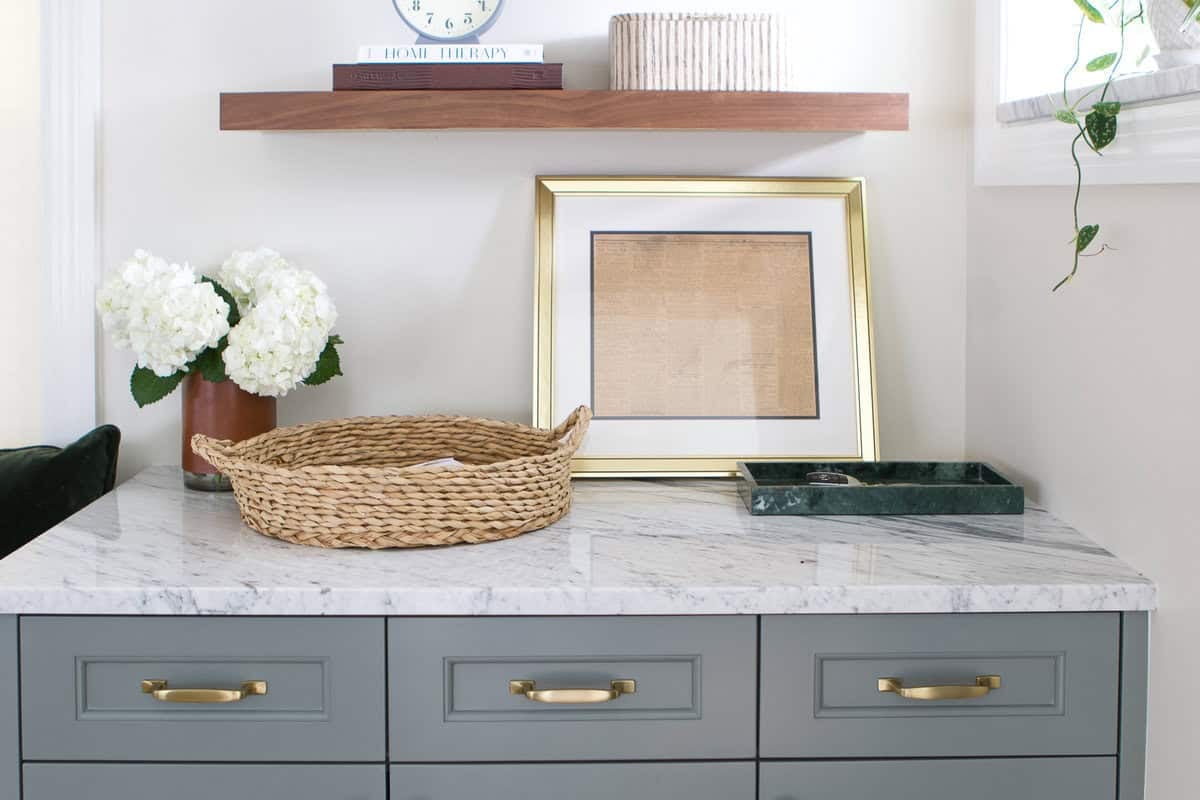 I knew from the start that I wanted marble here. Since this isnโt a wet area (no sink or water splashes to worry about), it felt like the perfect place to bring in a durable but beautiful stone. A friend of mine is a countertop fabricator, and he set aside a remnant just for us. Reach out if you want his information.