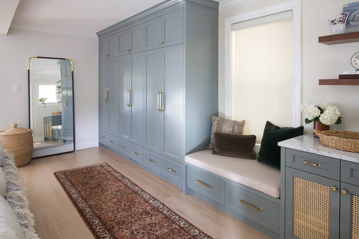 Now with custom cabinetry, a bench seat, and smart storage like drawers, hooks, and baskets, every family member has a place for their things. The best part is hearing guests walk in and say, โWhoa, this looks amazing!” because it’s the first place they see when they walk into our home.