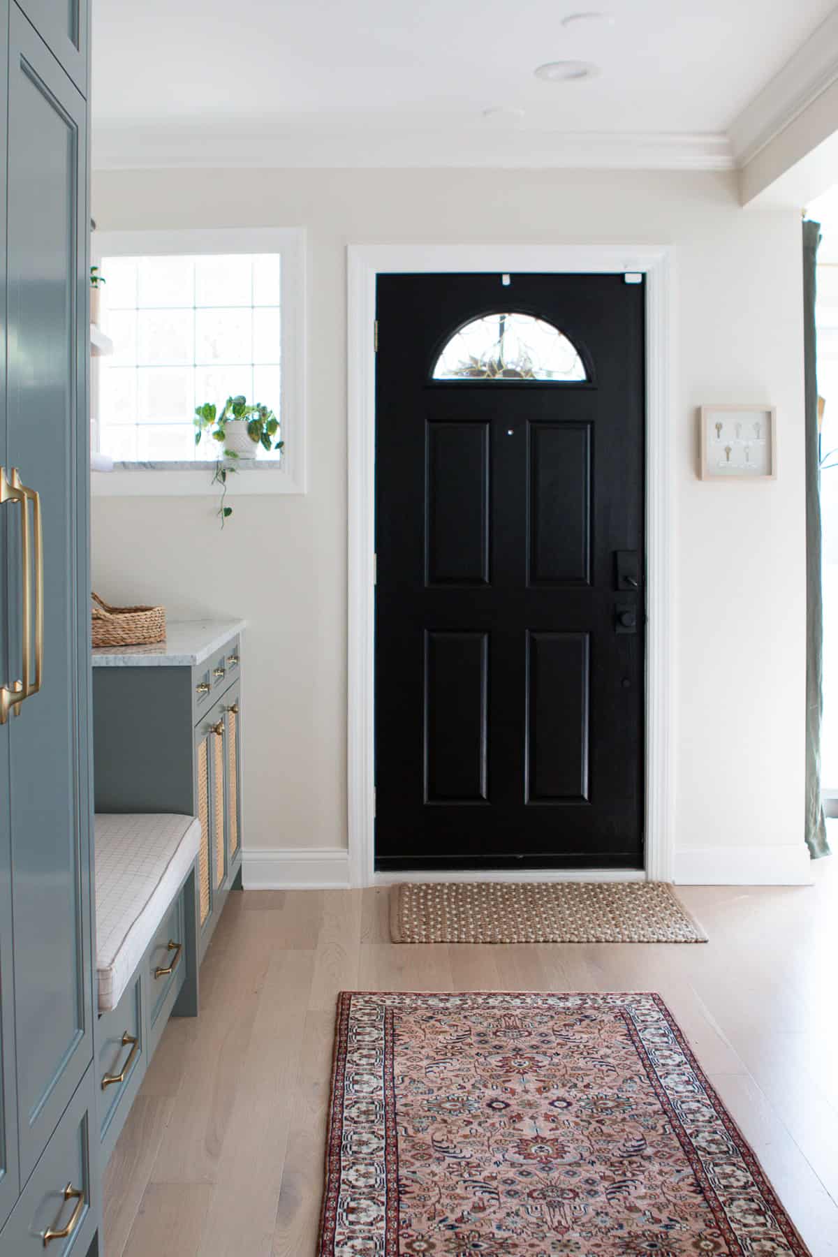 Because these mudroom cabinets were custom-made, my painter actually took a door from our kitchen island to the paint store to have it perfectly color-matched. Iโll include the exact color code below in case you want to try it yourself.