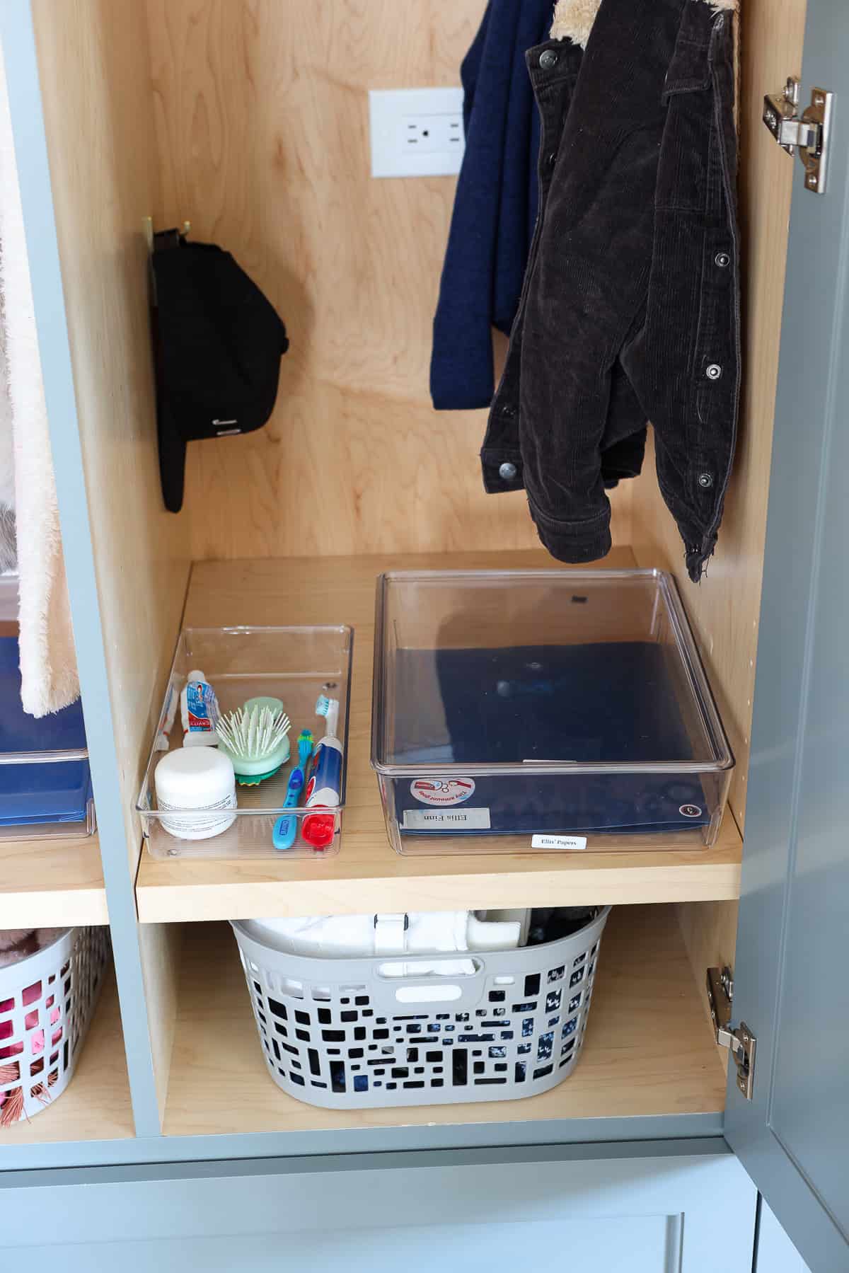 Each locker also has a few baskets. Thereโs one for hats, gloves, and winter gear, and another for toothbrushes and hair supplies. I know that one raises eyebrows, but if you have young kids, you understand. Mornings are chaotic, and keeping everything down here means no one is running upstairs after breakfast when weโre already late.