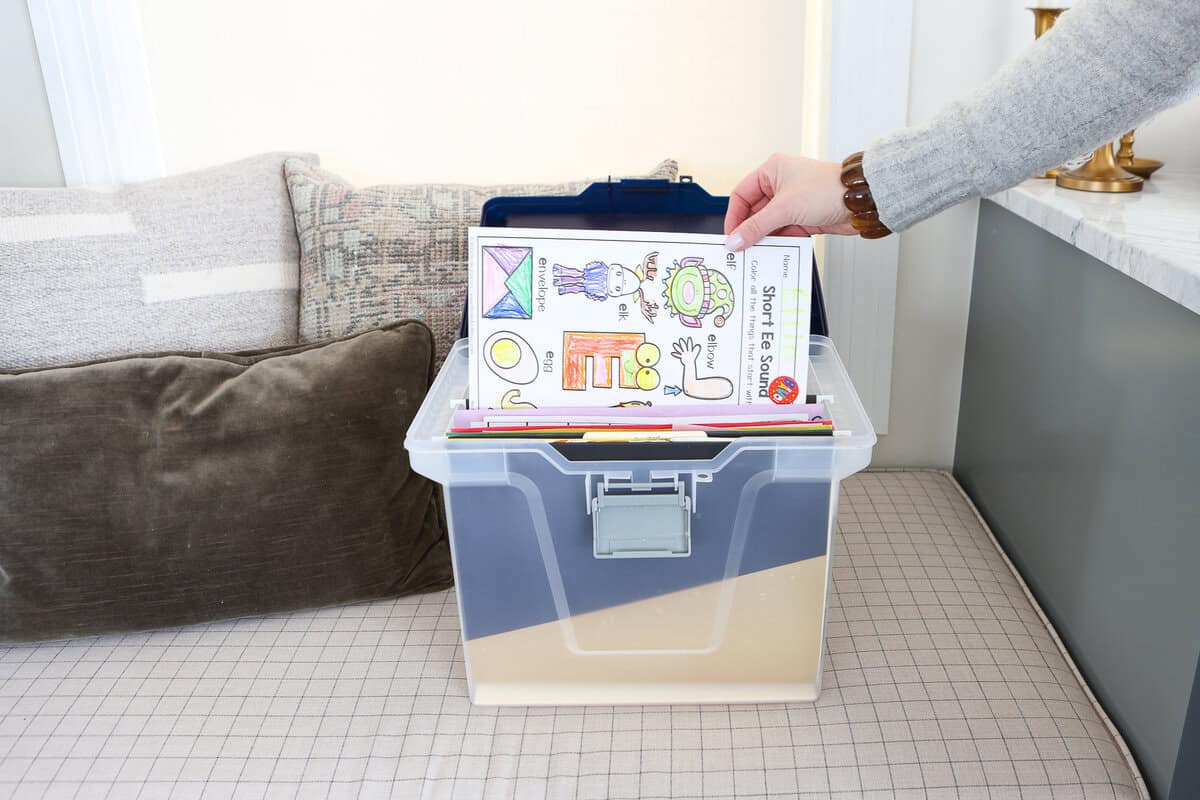 At the end of the week, we sort through the papers together. Some get tossed; a few go up on the fridge; and the best ones eventually move into labeled file boxes stored in the cabinets above.