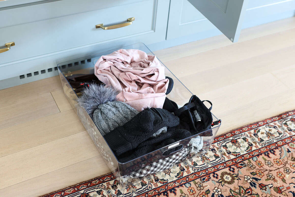This is where all of our snow boots and rain boots live, both for the kids and for us. We added waterproof liners to the bottom of the drawers so they can catch dirt, snow, and water and be easily wiped clean. The kidsโ boots fit perfectly. Our adult boots are a bit tall, so we lay them on their sides, but itโs worked just fine.