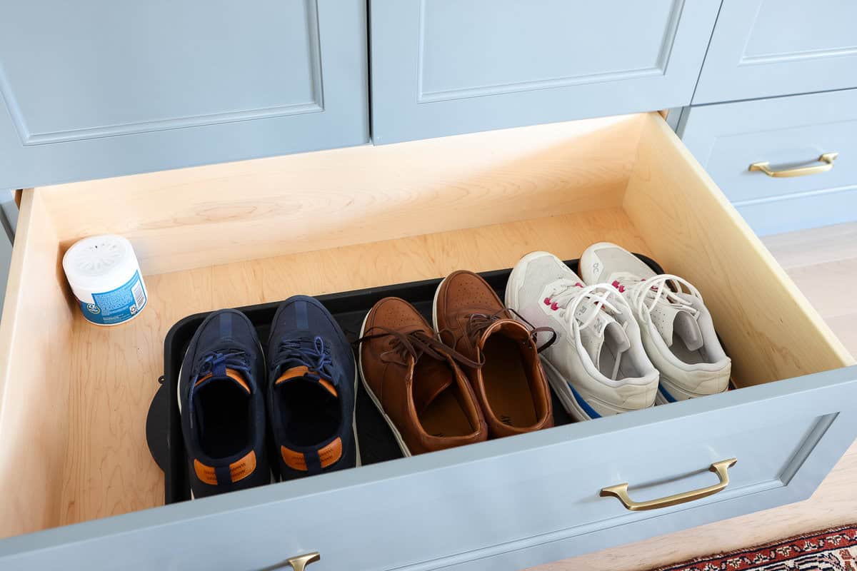 Below that is Finnโs shoe drawer. His feet are very large, so while the drawer works, it doesnโt hold as many shoes as we initially imagined.
