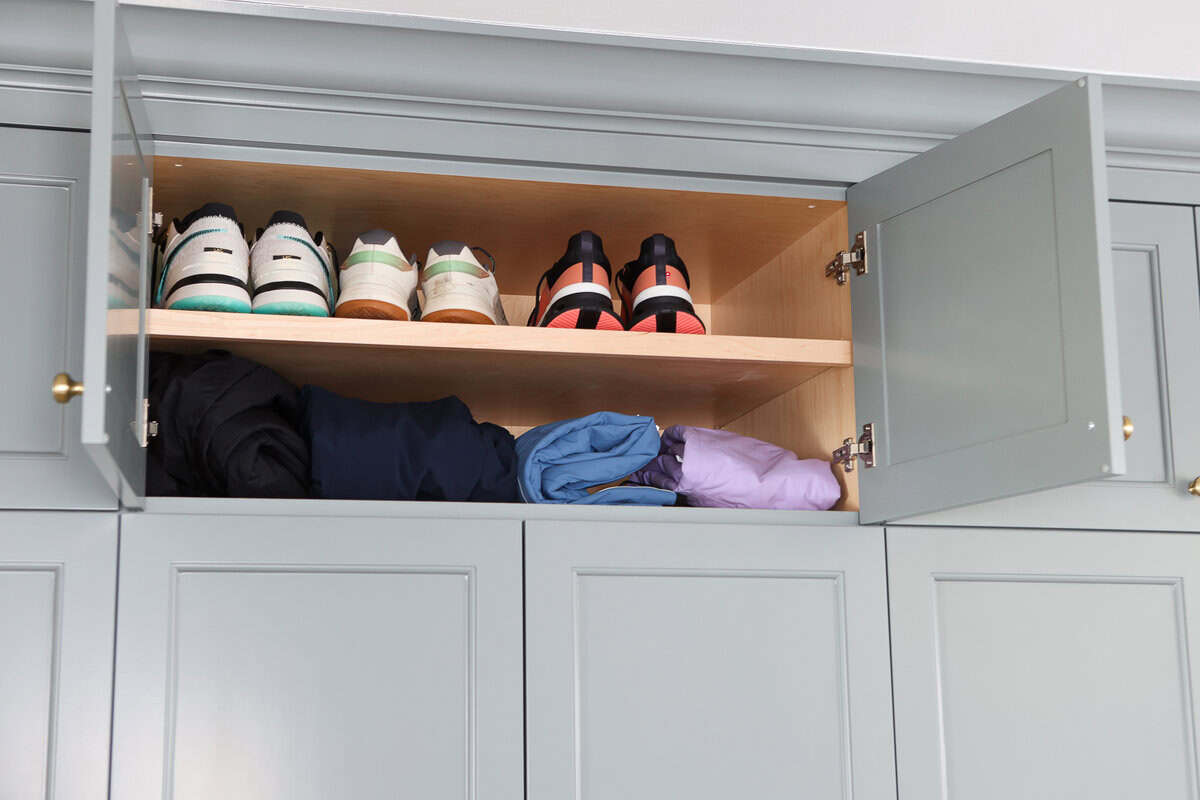 Because of that, he also uses the cabinets above for additional shoes, and we store snow pants up there as well. I actually like that this system evolved naturally after using the space for a while instead of trying to force a perfect setup from day one.