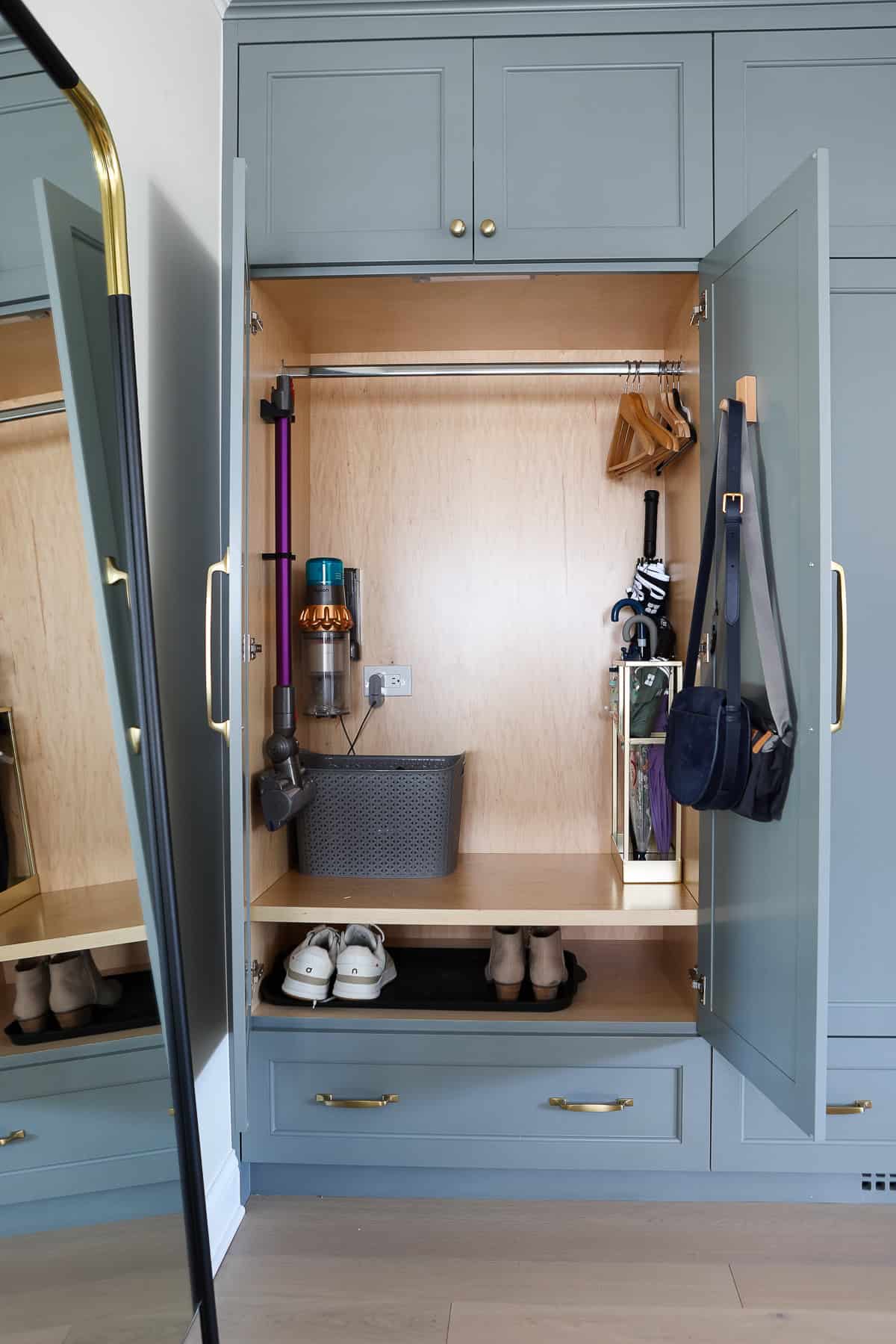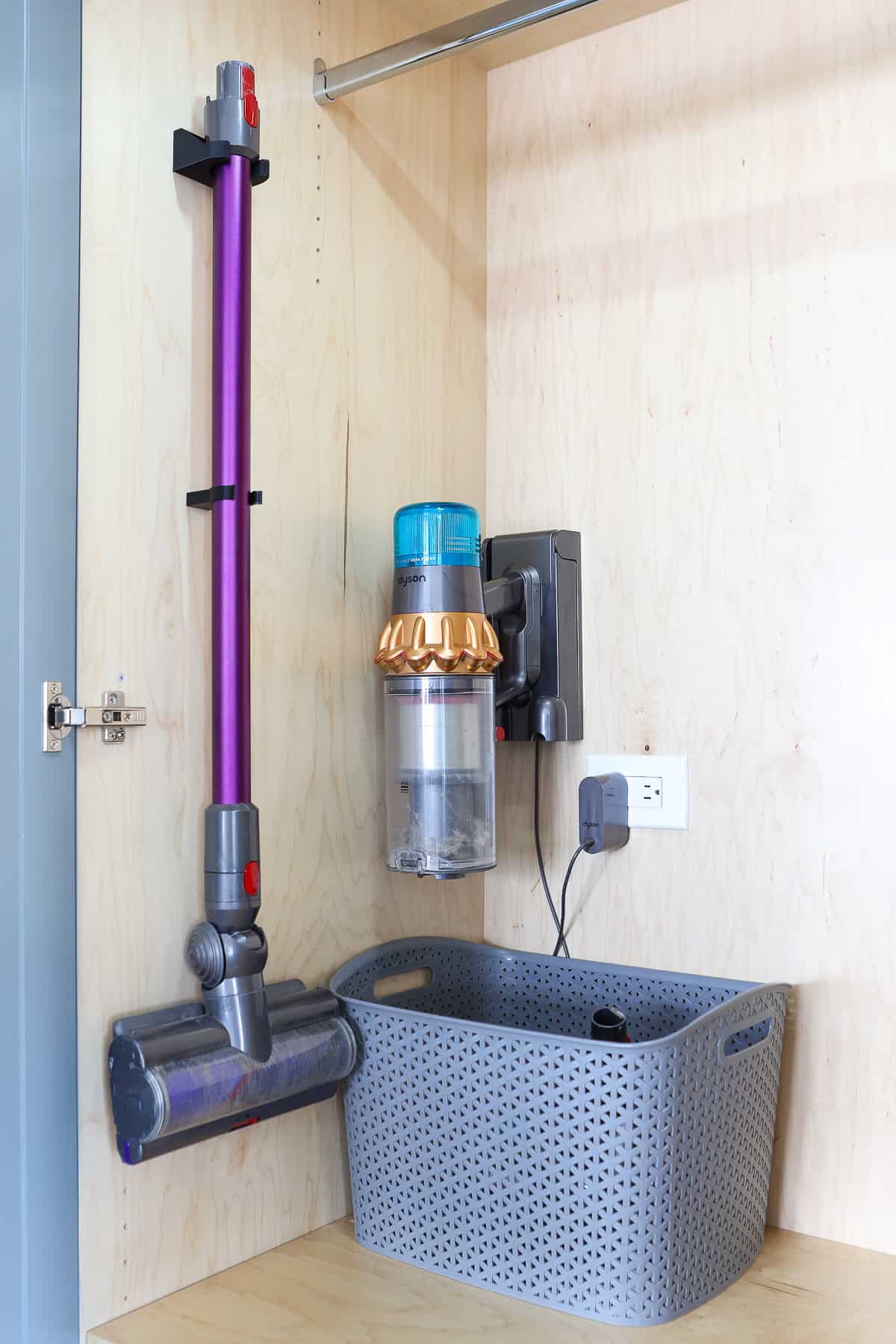 This same cabinet is where we store our Dyson. We installed an outlet inside so the vacuum can stay charged, and we keep all of the attachments in a basket nearby. Finn tracked down a wall-mounted piece that allows the long vacuum attachment to hang neatly instead of being awkwardly shoved into a corner. It took a while to find something that worked, but now everything stays hidden and easy to grab.