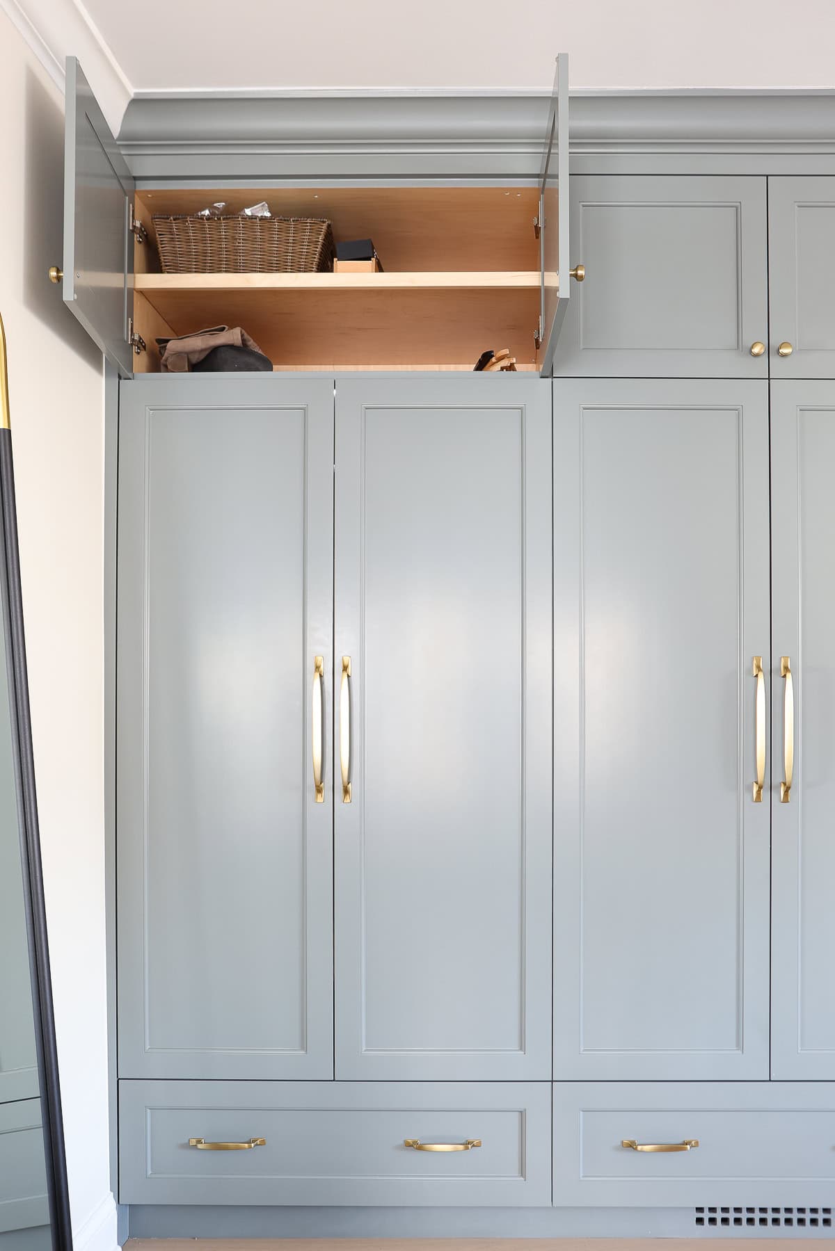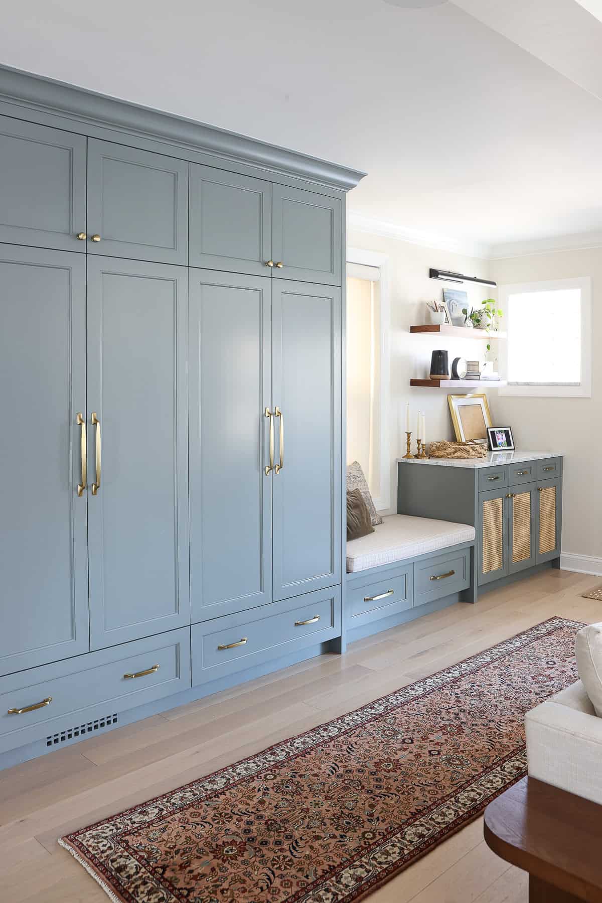 The middle section of the mudroom is primarily for me and Finn. These tall cabinets are where all of our coats live, and itโs also where I fully realized just how many coats I own. Winter coats, lighter jackets, raincoats โ they all live here now instead of being scattered between different closets and parts of our home.