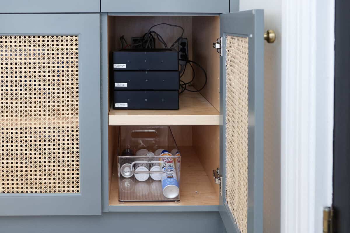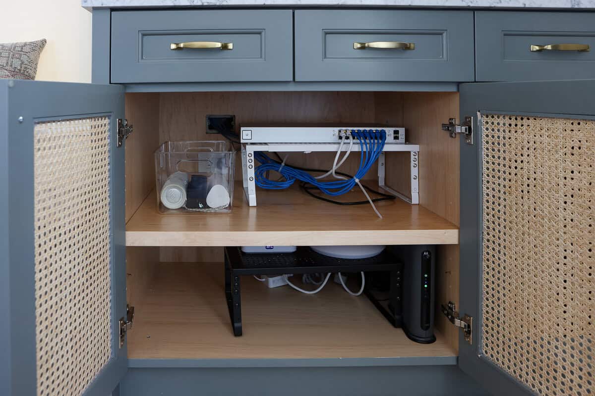 Below the drawers is where we keep all of our internet equipment. Thatโs why these cabinet doors have caning on the front. Airflow was important here. Finn also propped the equipment up on small risers so air can circulate underneath. In the same cabinet, we keep a clear container with our portable speakers that we grab when we go for walks or bike rides.