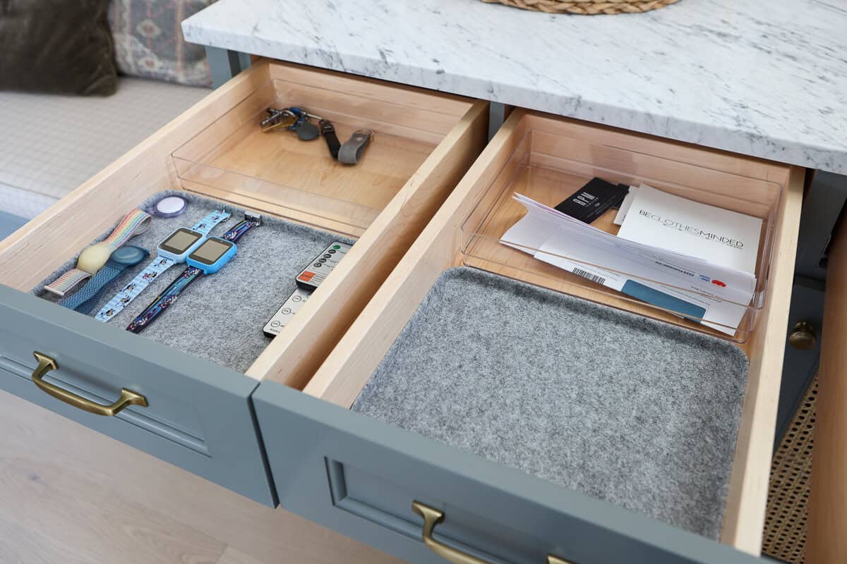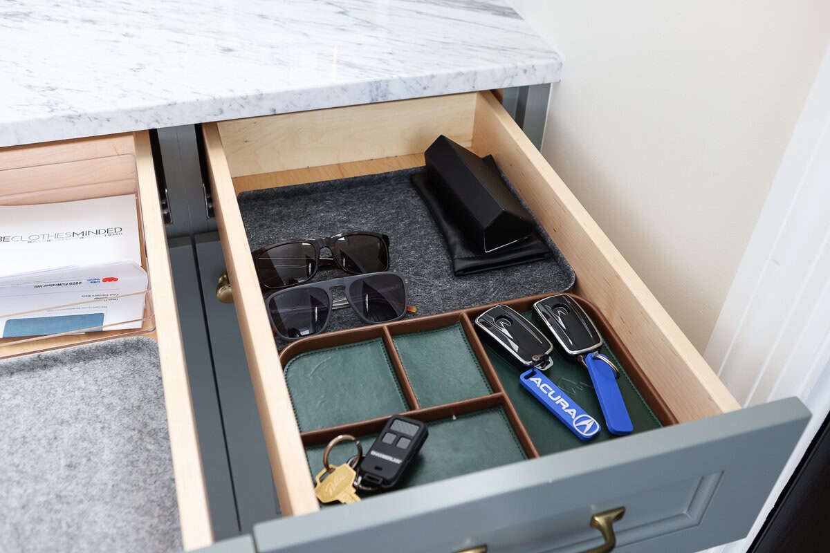 On the left, we keep the kidsโ watches and AirTags. The middle drawer holds a small collection of gift cards, and the drawer on the right is where we keep car keys and sunglasses. Finn found these great drawer compartments that fit perfectly inside and prevent everything from turning into a random pile.