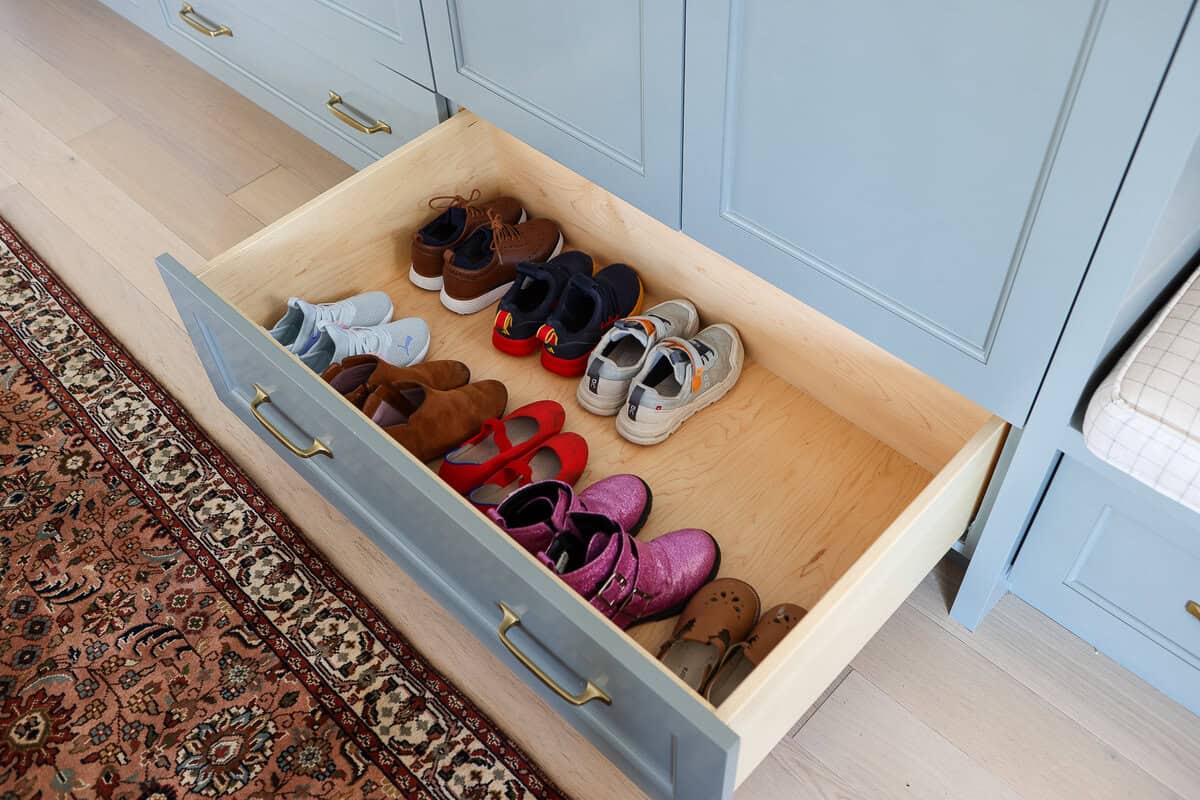 Under the mudroom cubbies, thereโs one large drawer dedicated entirely to kidsโ shoes. This pull-out drawer holds a surprising number of pairs and has made it easy for the kids to grab what they need without shoes spreading out all over the floor.