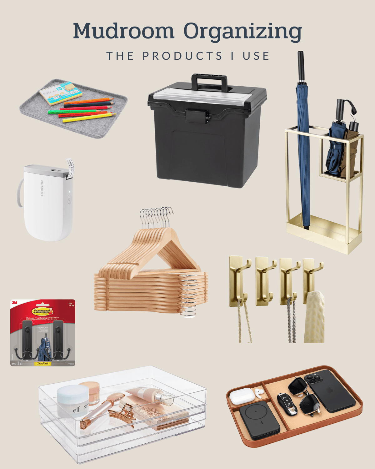 Gray Drawer Containers // Leather Drawer Tray // Clear Drawer Tray // Gold Hooks // Command Hooks // File Boxes // Wood Hangers // Label Maker // Umbrella Holder //