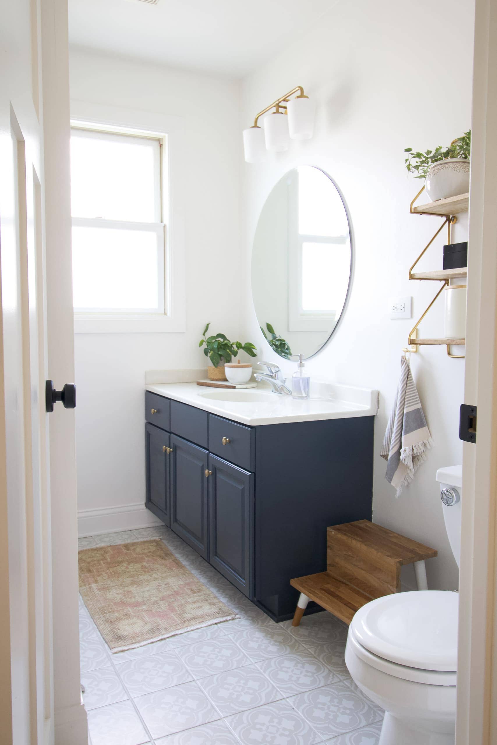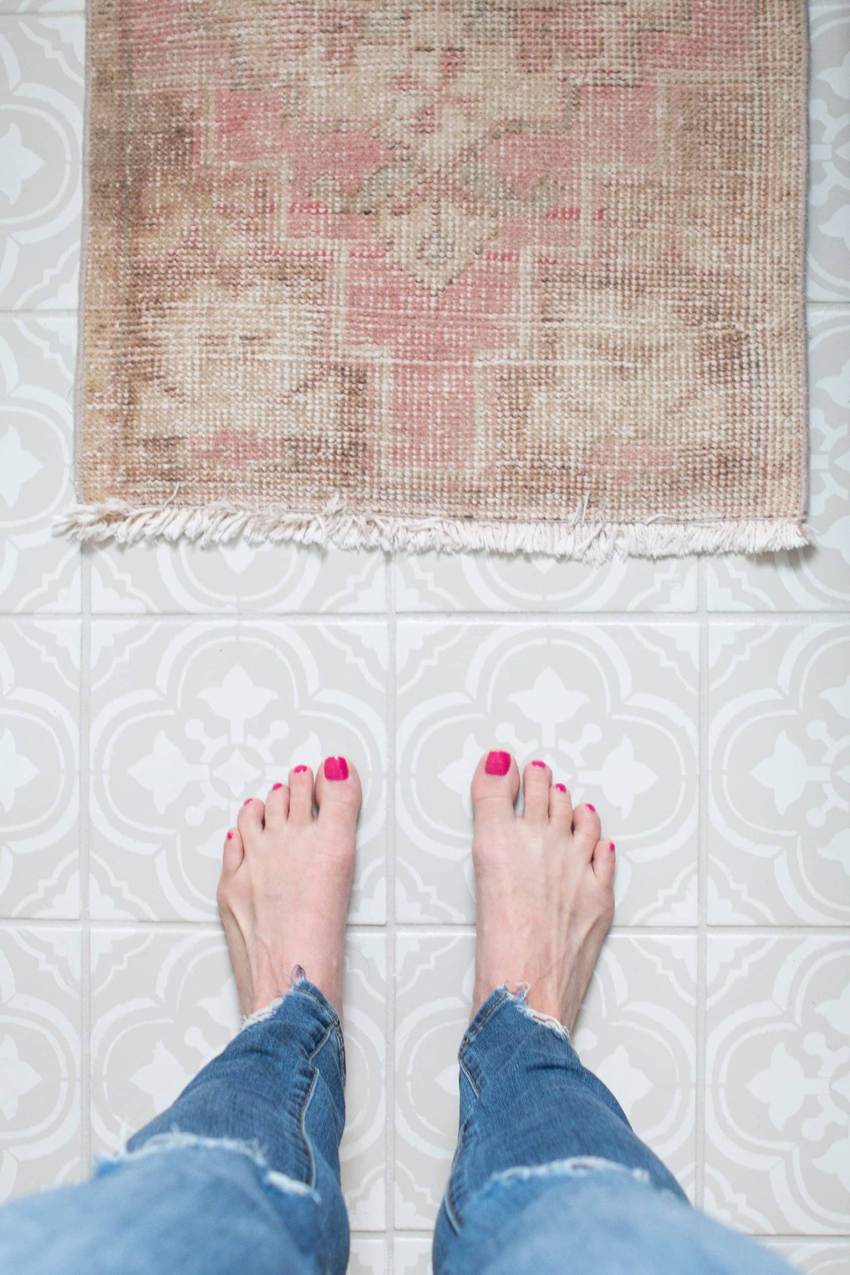 While you’re at it, you can also paint your bathroom tiles. We had generic white tiles in all three of our bathrooms and I painted all of them with fun stencils, colors, and patterns. These were such fun DIY projects and are incredibly budget-friendly.