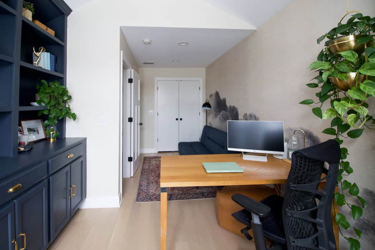 This room sat empty until winter 2020 when we tackled our biggest DIY project yetโcustom built-ins! I also added a wall mural and new furniture, turning it into a stylish and functional workspace that I use every single day!
