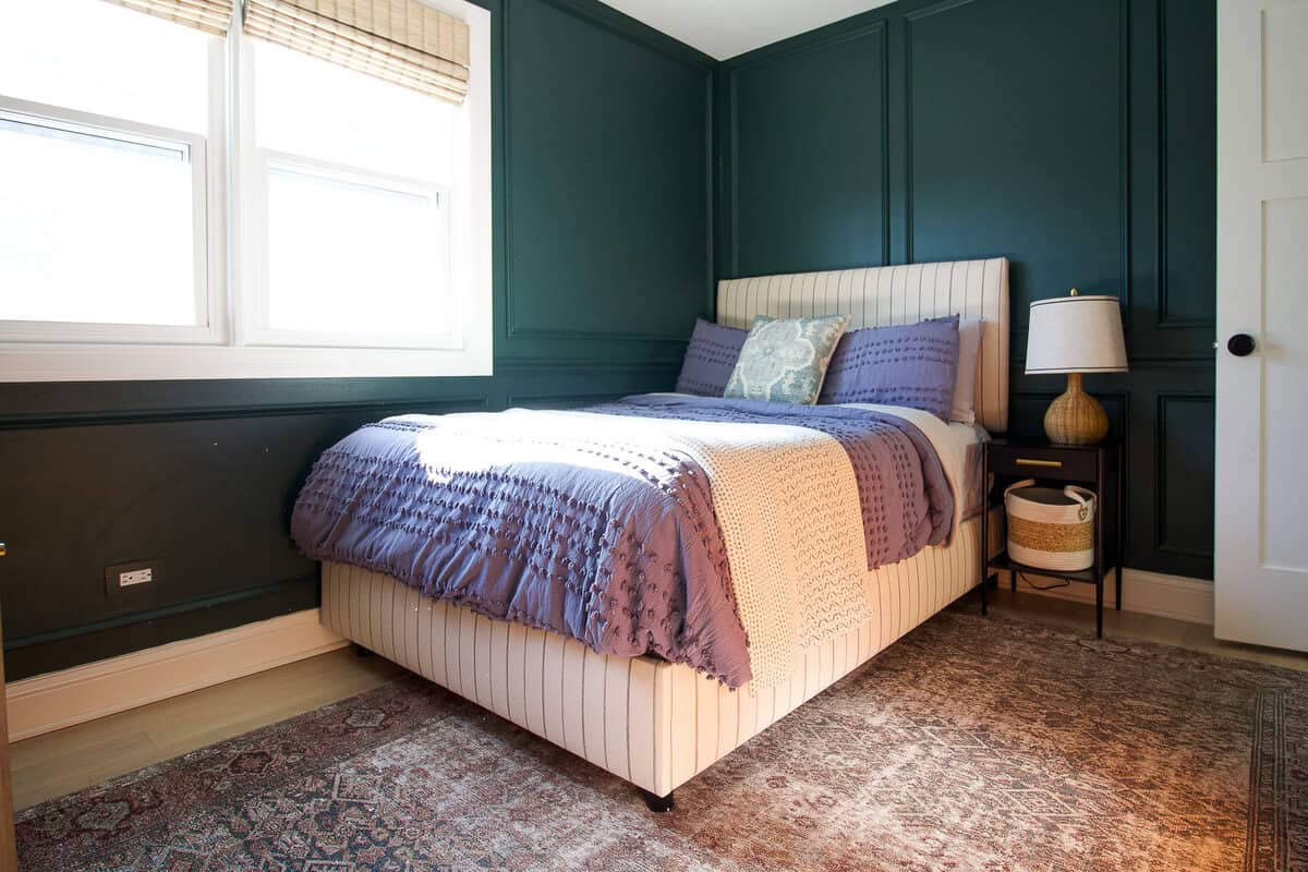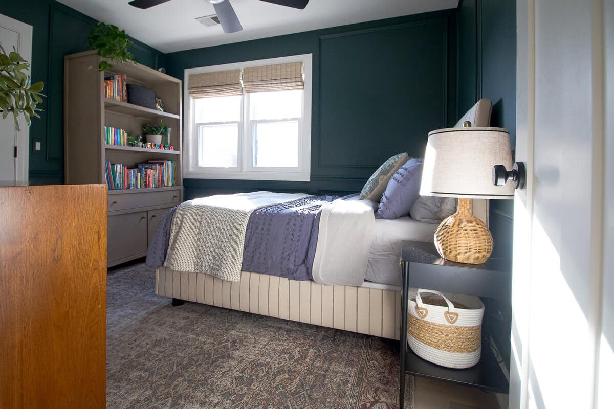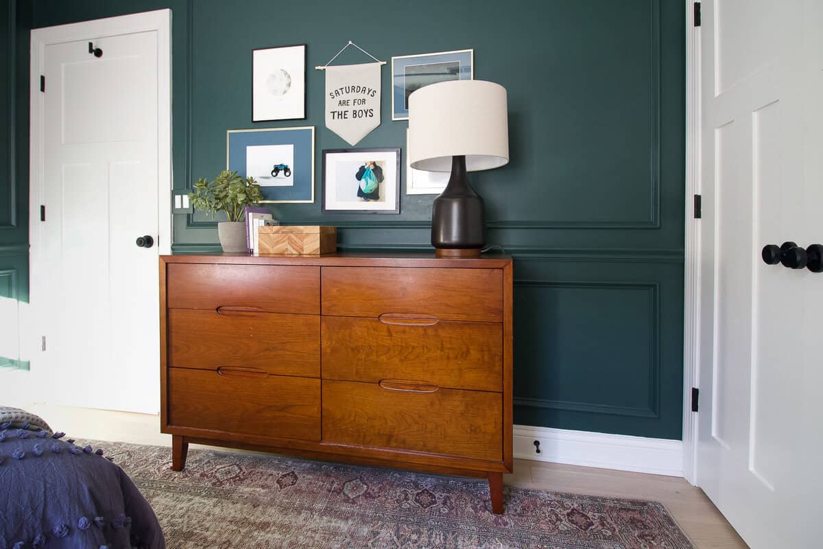 We went bold with a deep green for Ellisโ room, making it the coziest space in the house. I installed picture frame molding while pregnant and still adore this subtle addition to the walls. When Ellis turned three, we gave it a fun big-boy update!