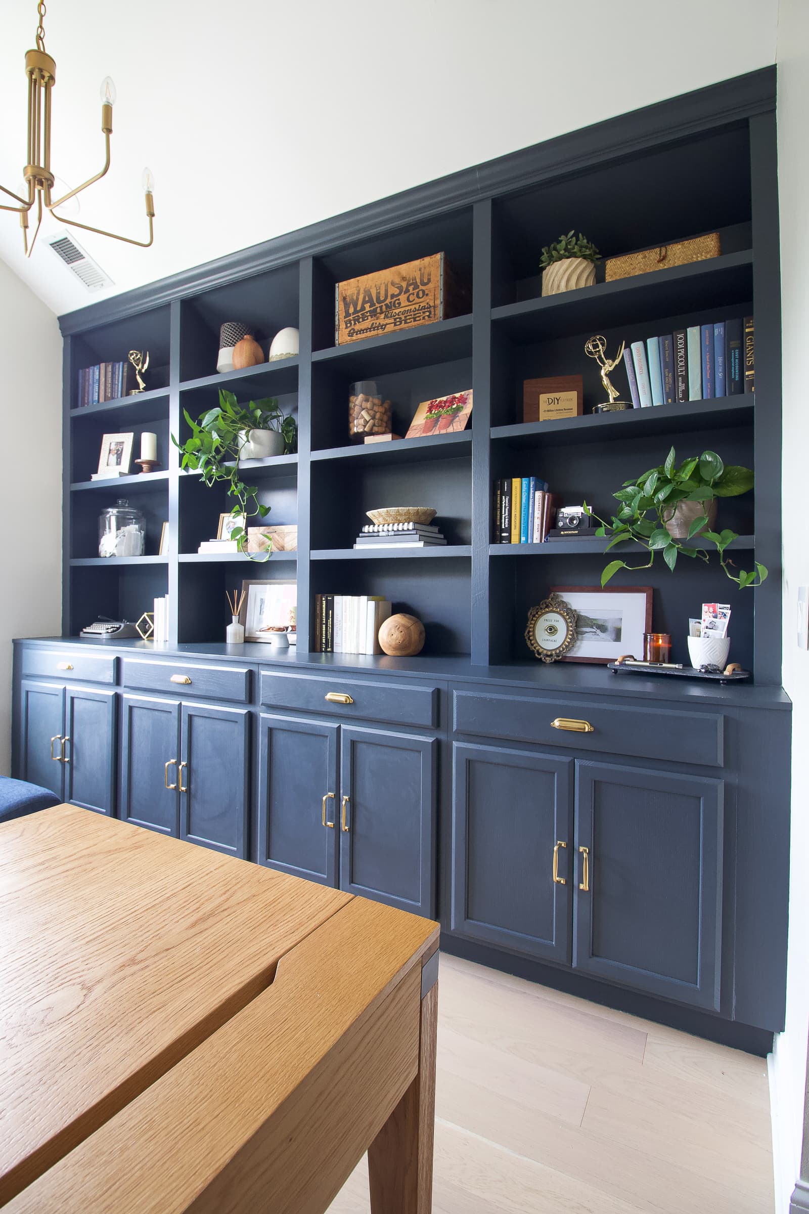 Paint Colors: Benjamin Moore โBallet Whiteโ (walls); Valspar โChimney Smokeโ (built-ins) // DIY Built-Ins // Home Office Reveal // DIY Office Closet
