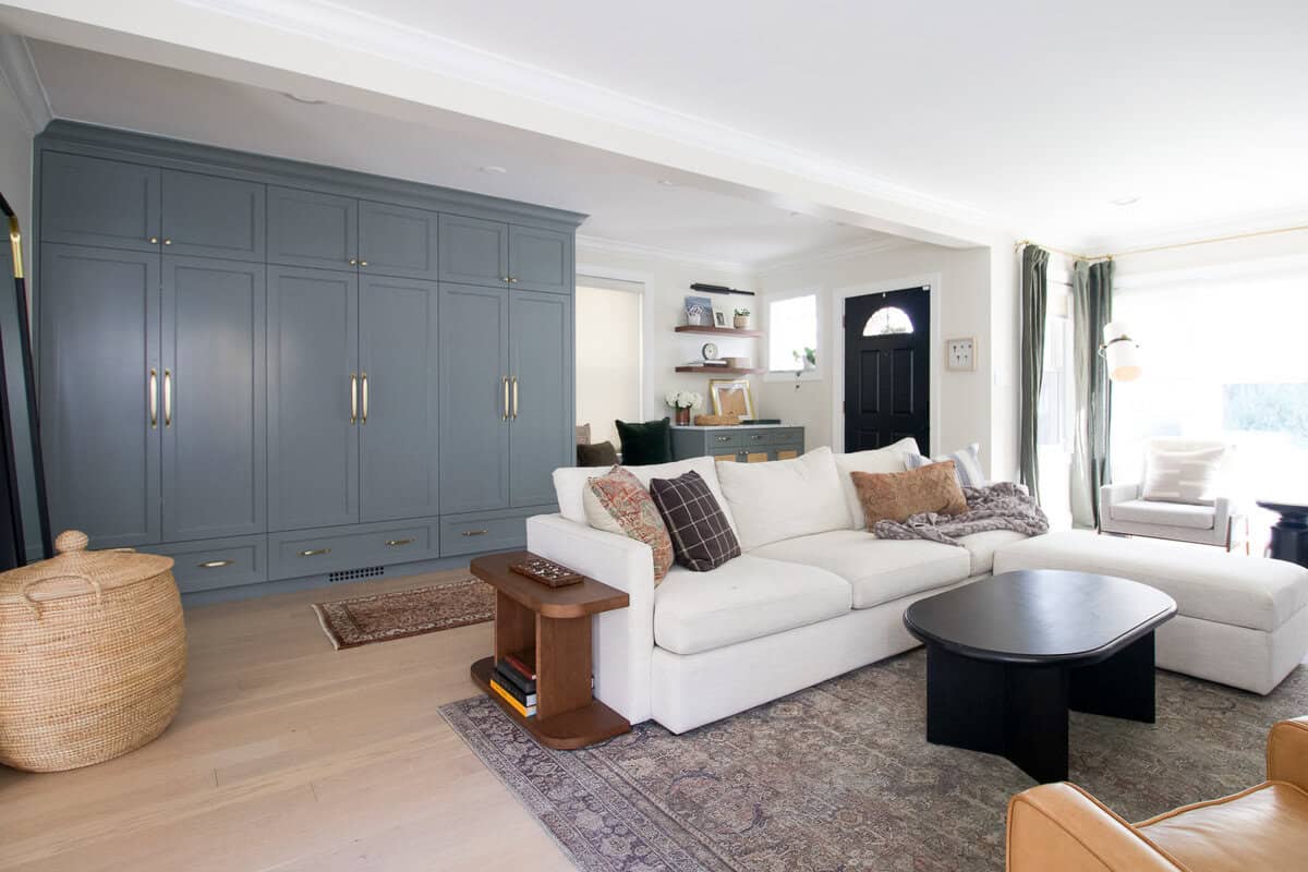 We made big changes in this space right away, tearing down a wall and replacing it with a ginormous steel beam. It was quite the saga (with plenty of permitting headaches), but in the end, we gained a much larger and more functional living room! In 2025, we added a mudroom in the entryway for additional storage and style.