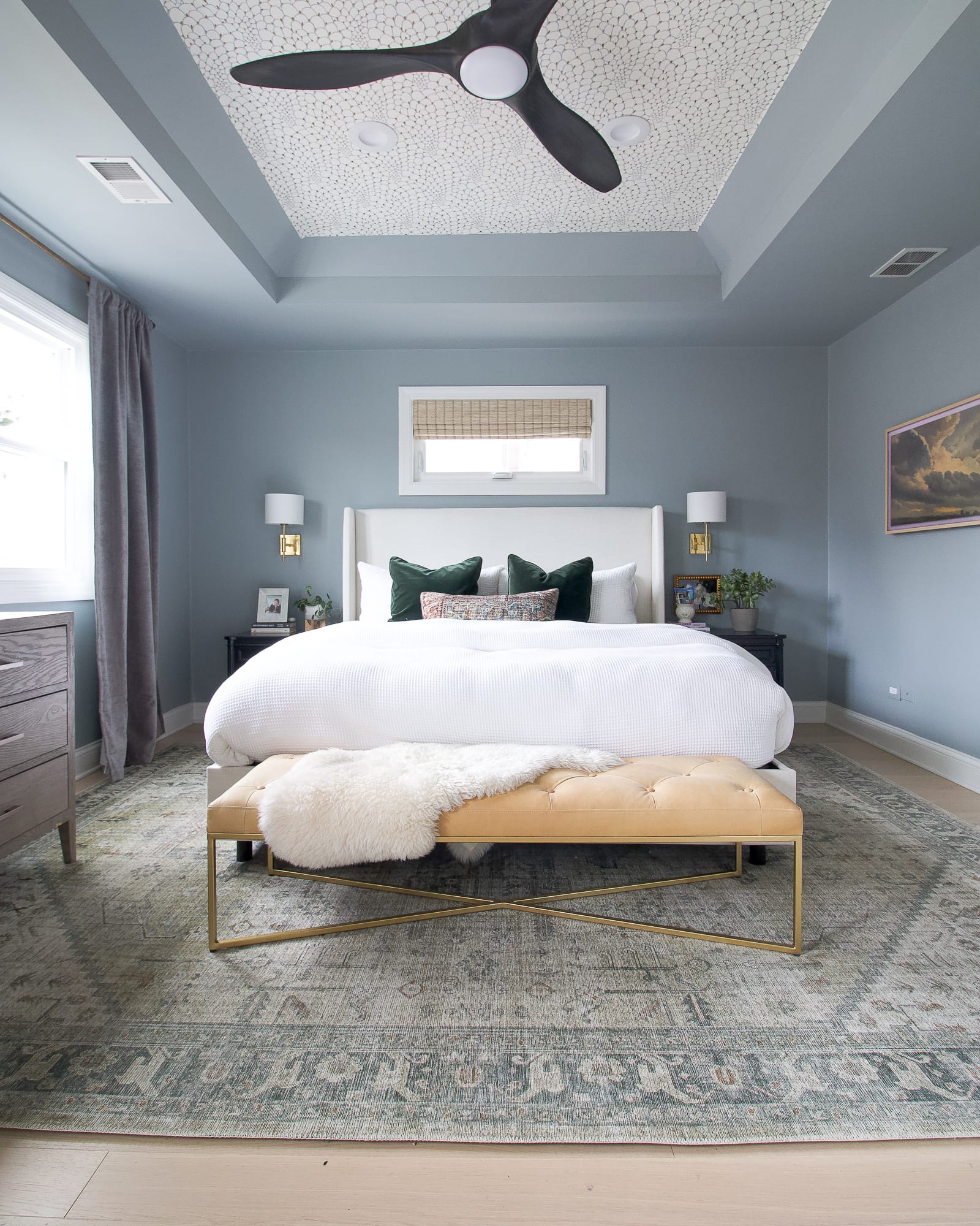 After living in the space for about a year, we decided to take things to the next level. We wallpapered the ceiling, I painted the walls a pretty blue-gray color, and we added lots of personality with furniture and our new Frame TV. It is now a serene oasis at the end of a long day.