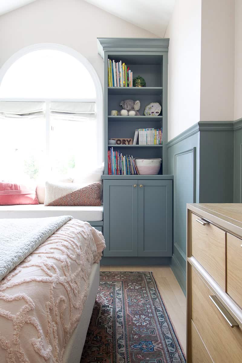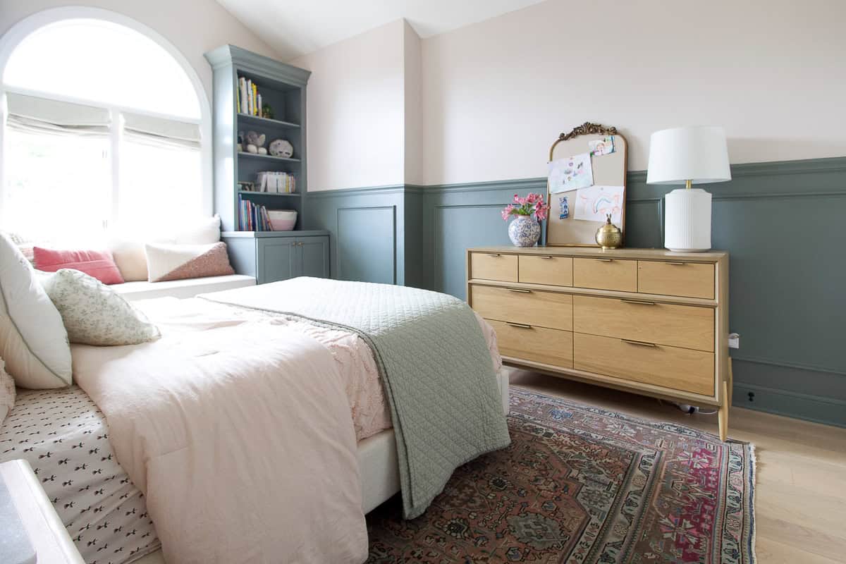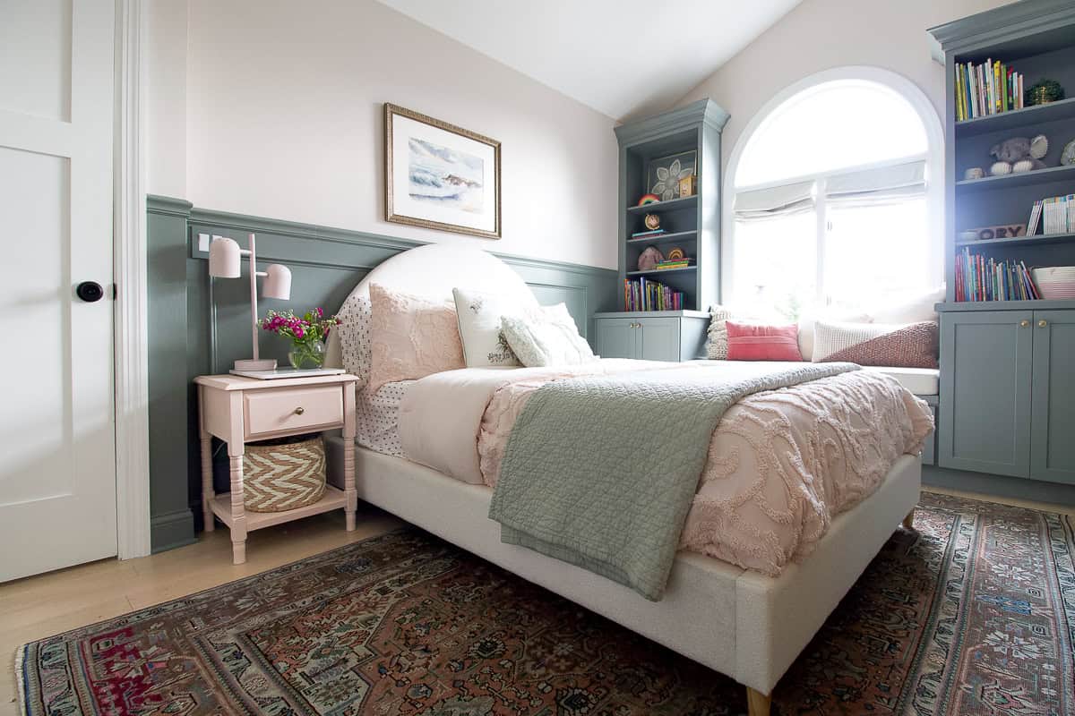 Our daughter’s room is my favorite room in the house. We took it from a blank space and added so much personality with DIY chair rail, custom built-ins, and the prettiest blush color on the walls. When she turned four, I turned the space into a big girl bedroom.