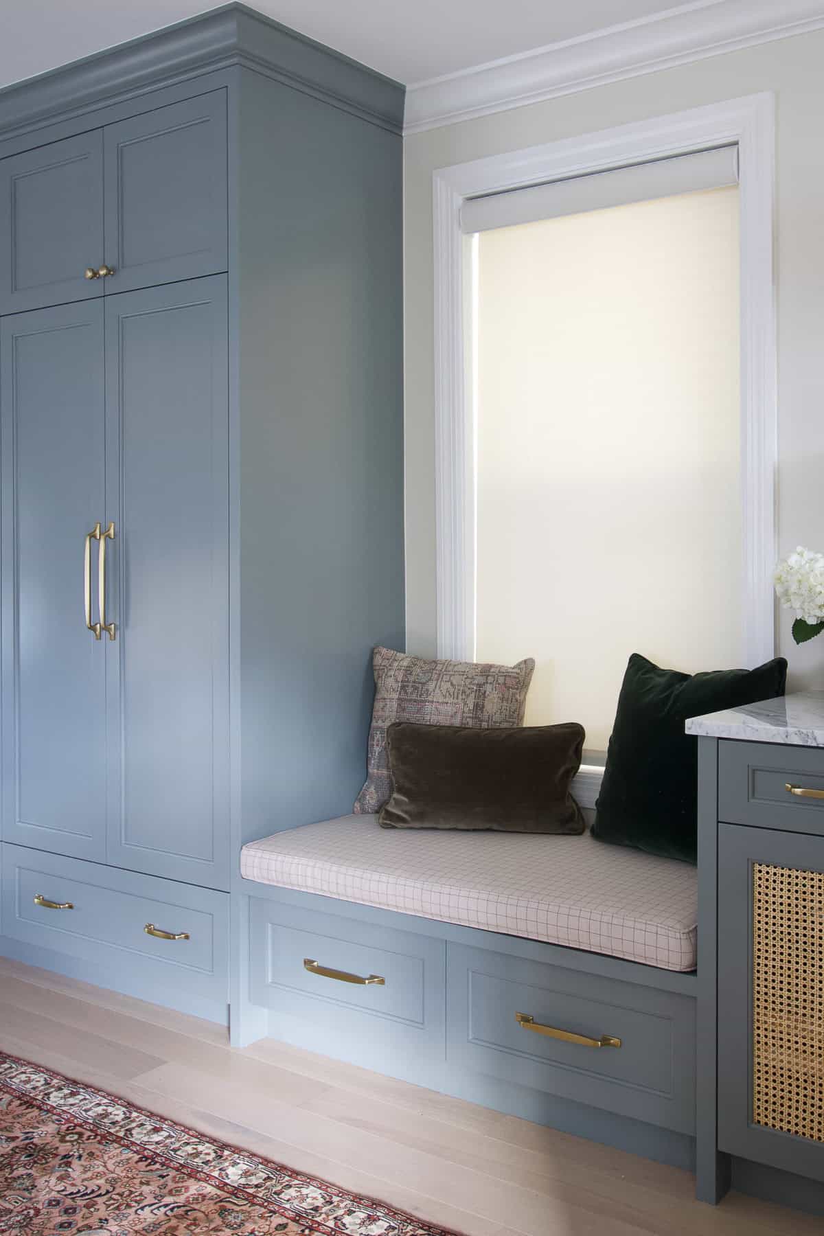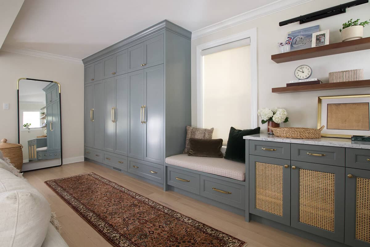 - Bench & Window Wall โ Instead of wasted space, we now have a cozy bench under the window with deep drawers for shoes and a custom cushion that makes it both functional and inviting.
