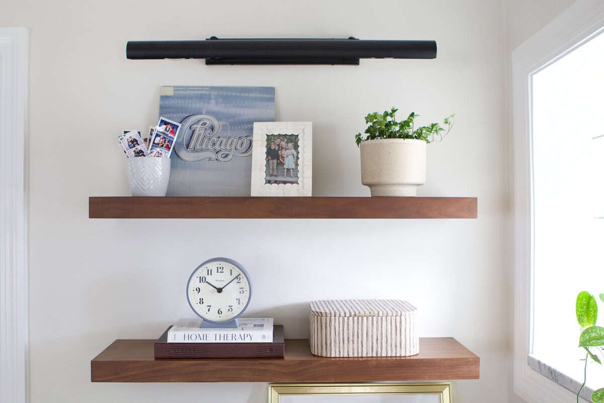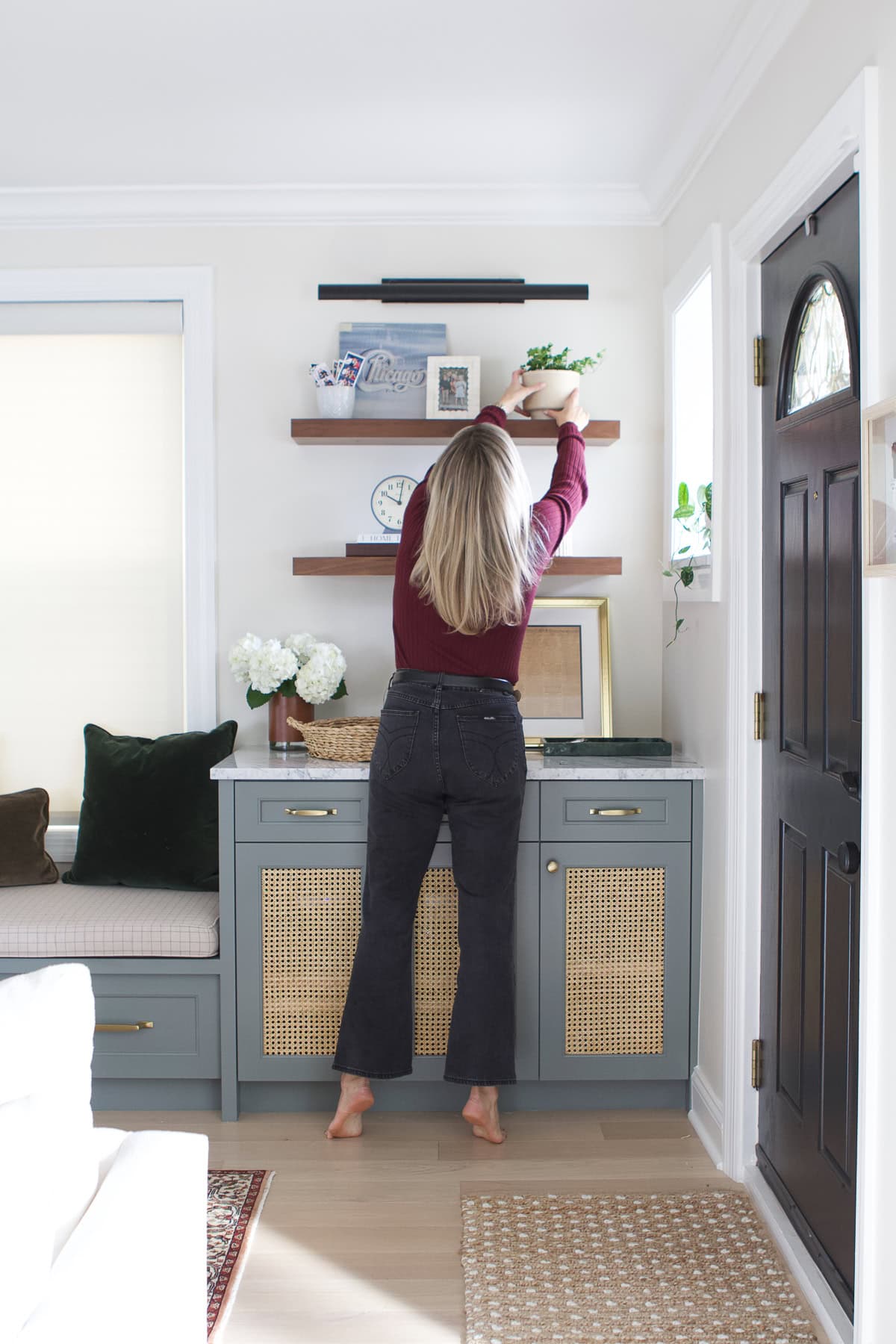 Above the countertop, we added floating wood shelves that are lit by a black picture light. (If you missed it, I have a full post on how to choose picture lights and my favorites here.)
