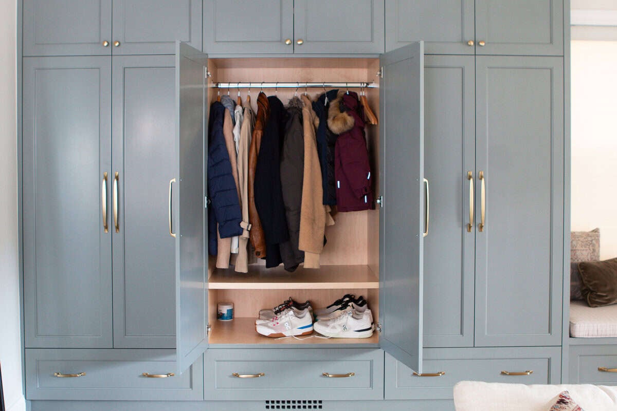 - Locker Wall โ The biggest change of all: a full wall of custom cabinetry with lockers for the kids, tall cabinets for coats and bags, and utility storage for our vacuum and umbrellas.