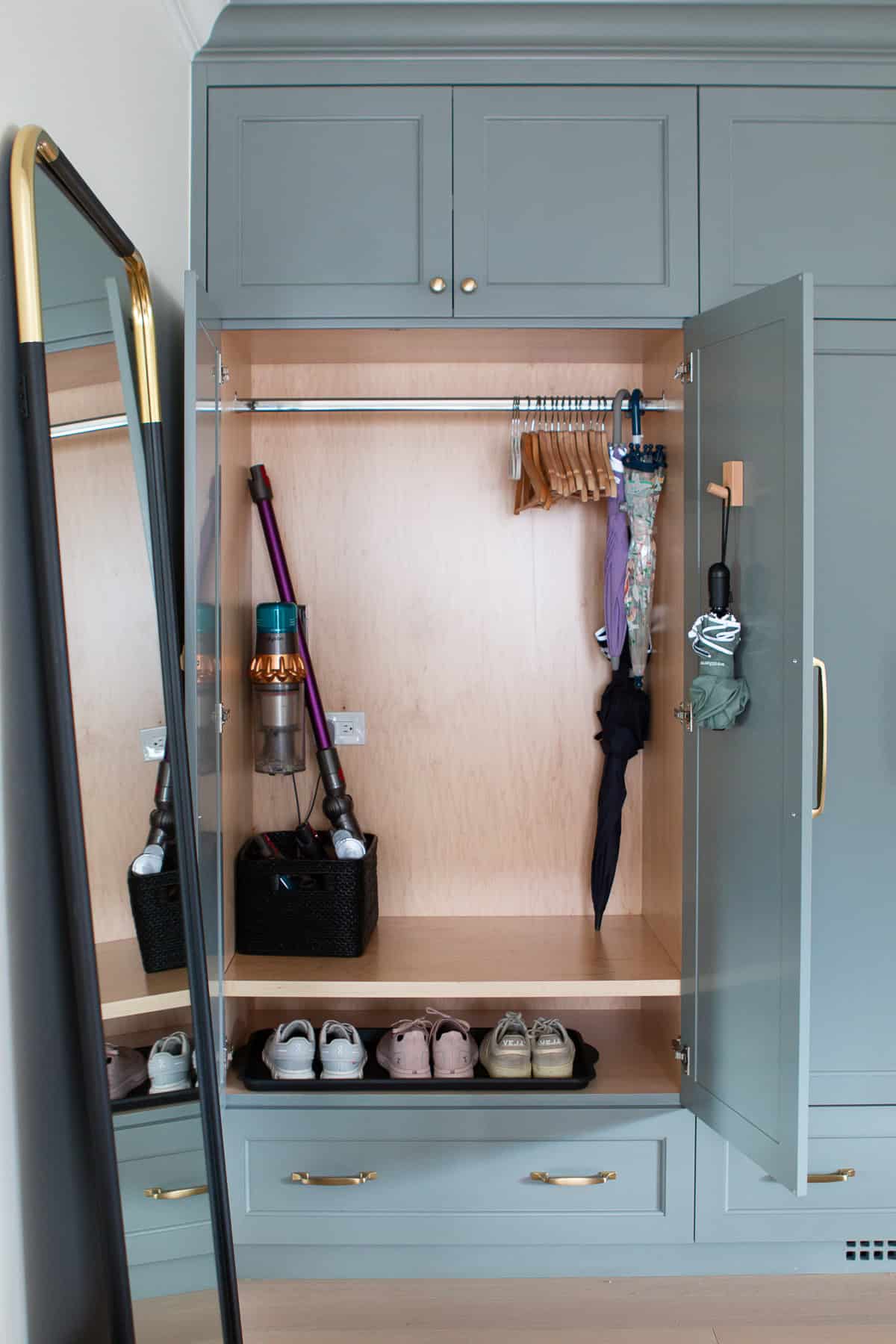 On the far left, thereโs a tall cabinet for the vacuum, vacuum accessories, umbrellas, and even space for guest coats. Plus, a shoe tray for any wet or super dirty shoes.