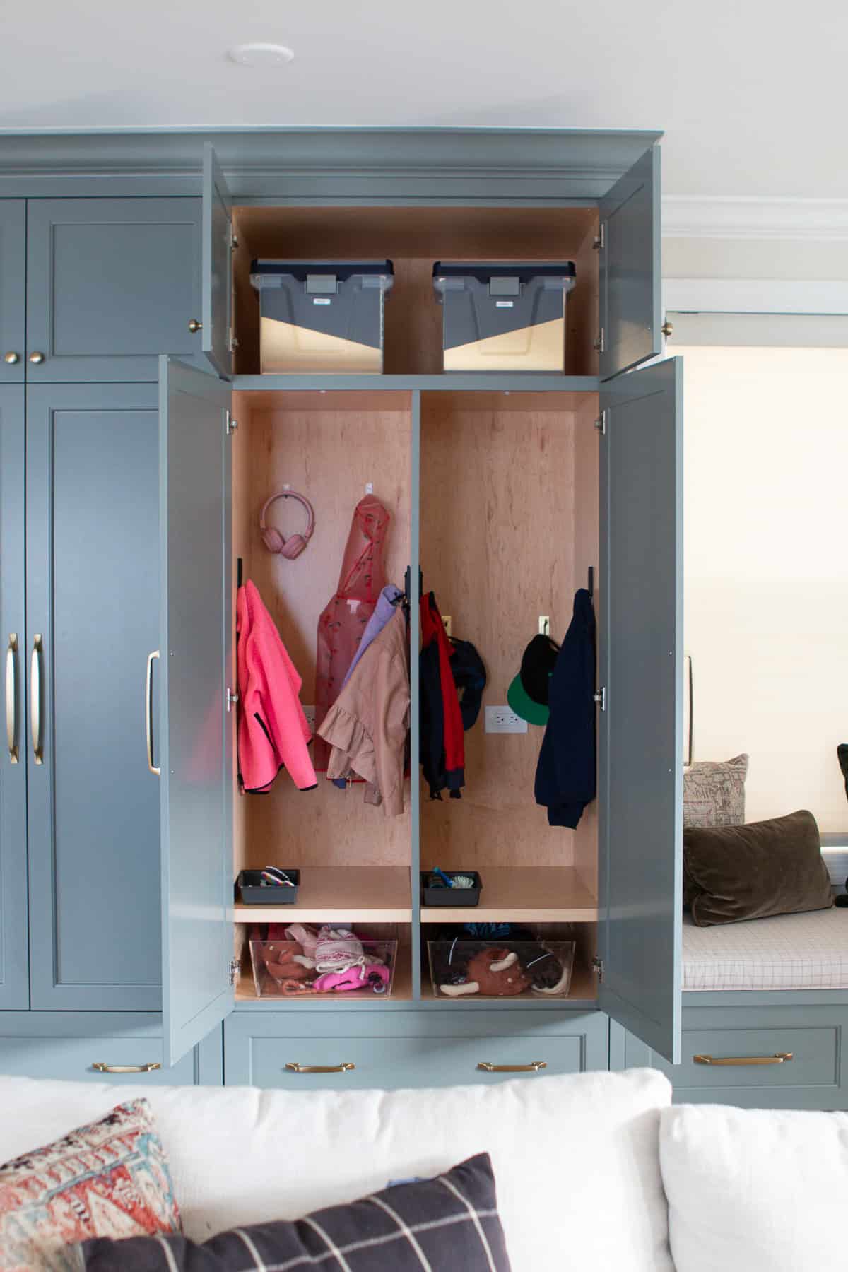 Next to the kidsโ lockers, we added tall cabinets with rods for coats. These hold all of the adult jackets, along with some of Finn’s shoes. Above we store our soccer bag, pool bag, and the family backpack we grab for bike rides and outings.