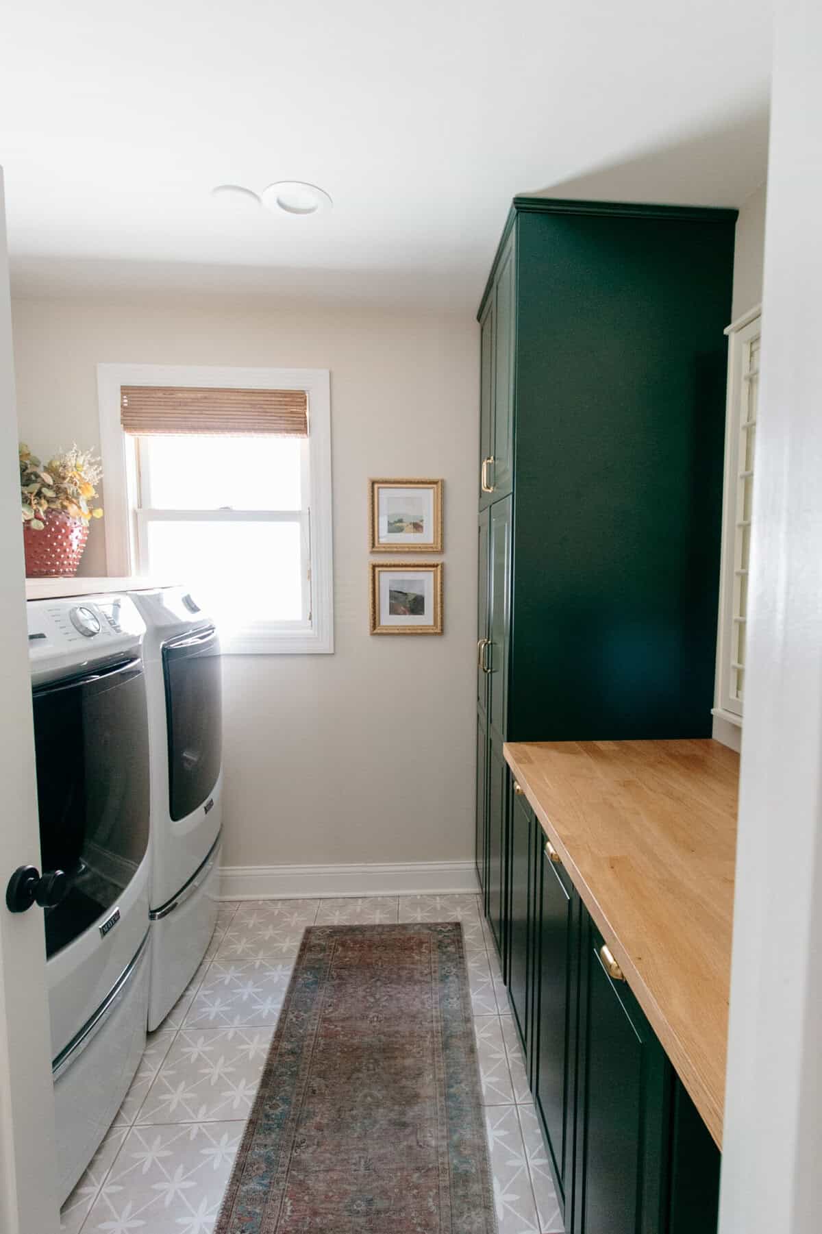 When I was searching for a new kitchen runner, I knew I wanted a vintage piece that was 100% wool and at least 10 feet long. I ended up finding a gorgeous Serapi runner on eBay (2.5 feet by 12 feet), and the second we rolled it out, the kitchen came alive. The colorful pattern completely transformed the space, instantly making it feel more like home โ lively, warm, and inviting.