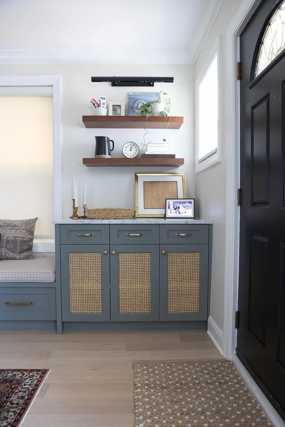Before we start the cabinet-by-cabinet tour, here are all of the posts you may have missed about our built-in mudroom cabinets and transforming this small entryway to give us extra space.