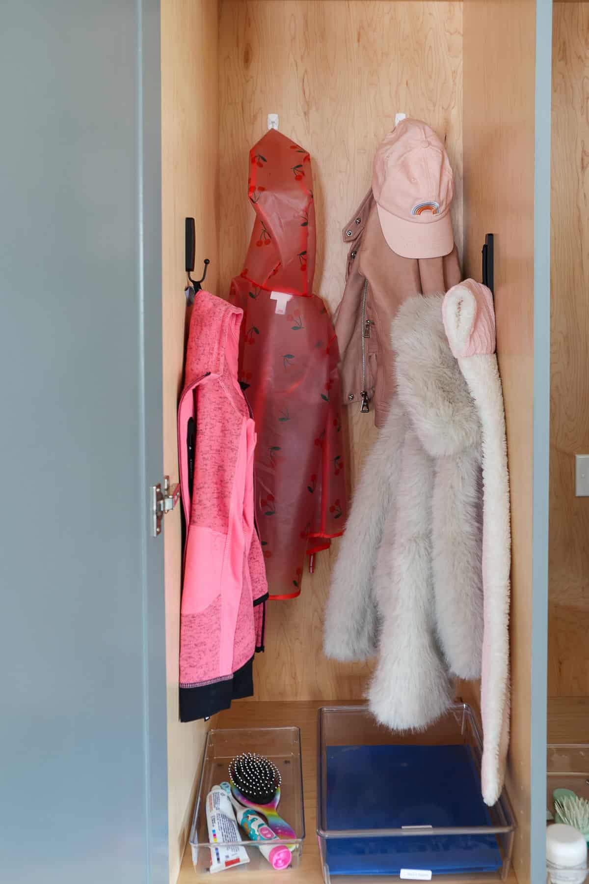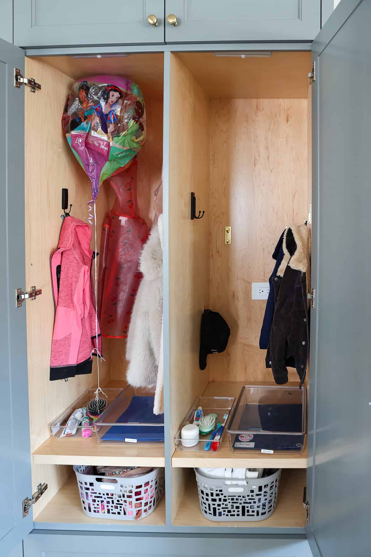 Inside each locker, we added hooks for coats and space for backpacks. I chose removable sticky hooks instead of drilling into the cabinets because I know weโll want to move them higher as the kids grow. Right now, the hooks are low enough for the kids to handle everything themselves, which was the goal.