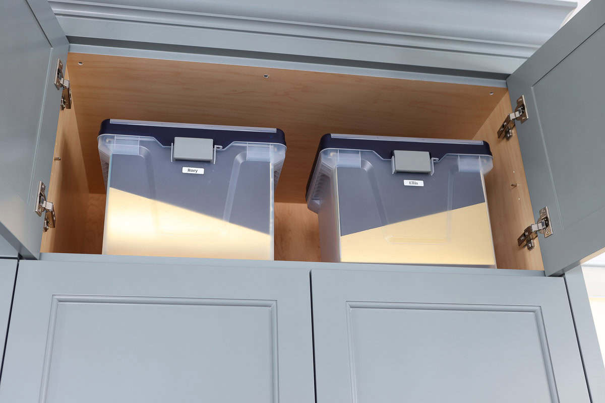 Next are the kidsโ cabinets, and this is the part of the mudroom thatโs made the biggest difference day to day. Each child has their own mudroom locker, which gives every family member their own space for coats, backpacks, and daily essentials.
