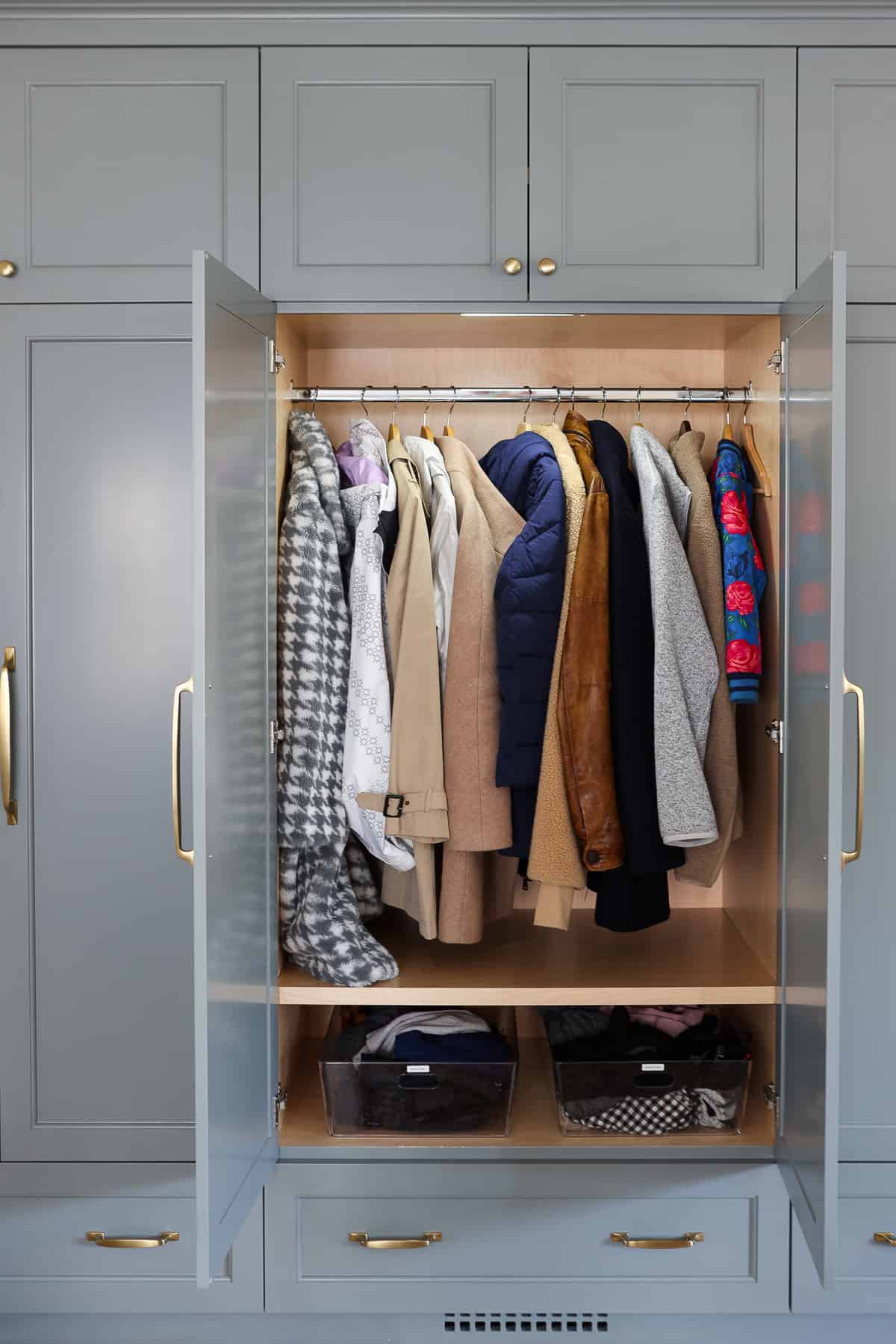 The middle section of the mudroom is primarily for me and Finn. These tall cabinets are where all of our coats live, and itโs also where I fully realized just how many coats I own. Winter coats, lighter jackets, raincoats โ they all live here now instead of being scattered between different closets and parts of our home.