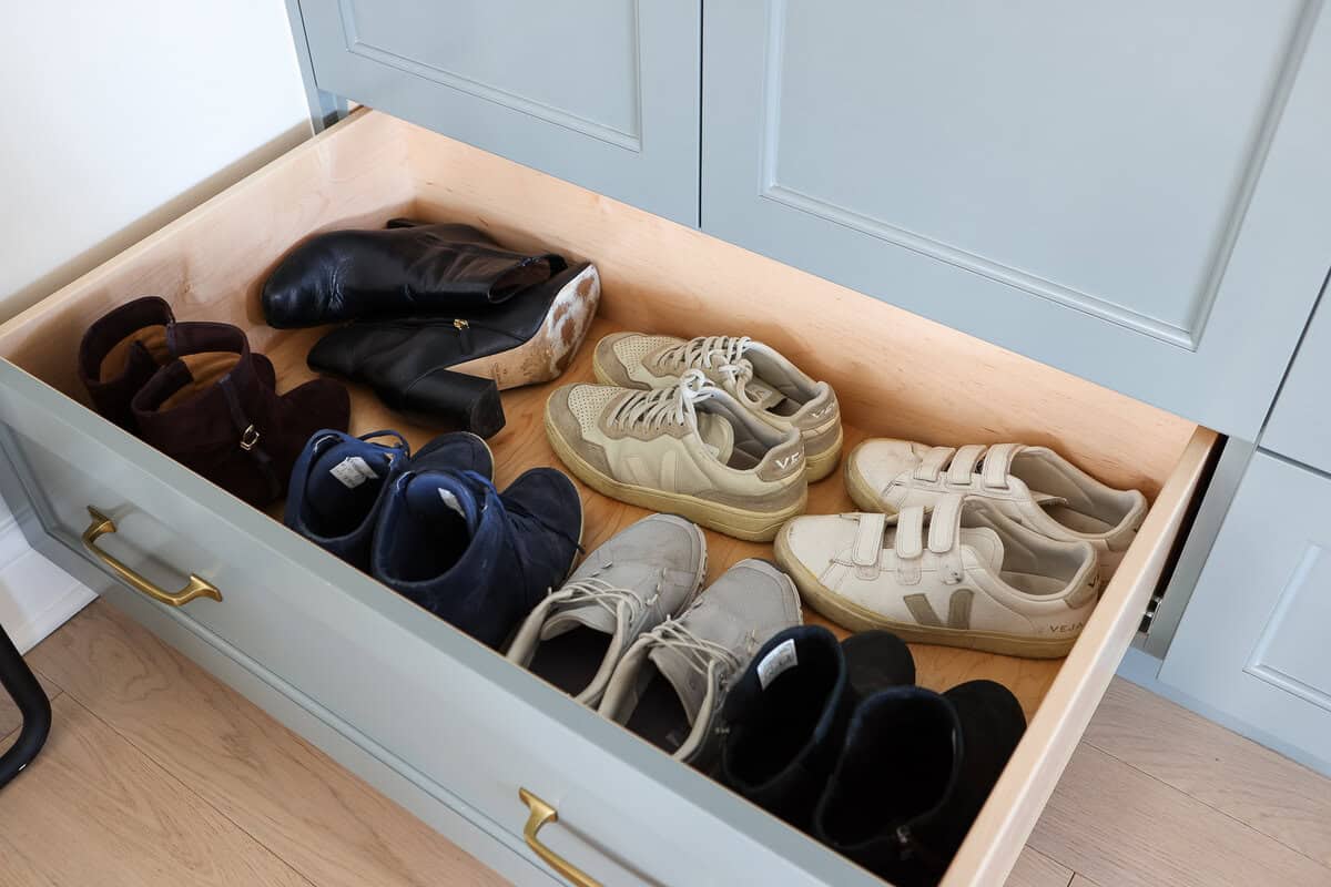 Under the mudroom cubbies, thereโs one large drawer dedicated entirely to kidsโ shoes. This pull-out drawer holds a surprising number of pairs and has made it easy for the kids to grab what they need without shoes spreading out all over the floor.