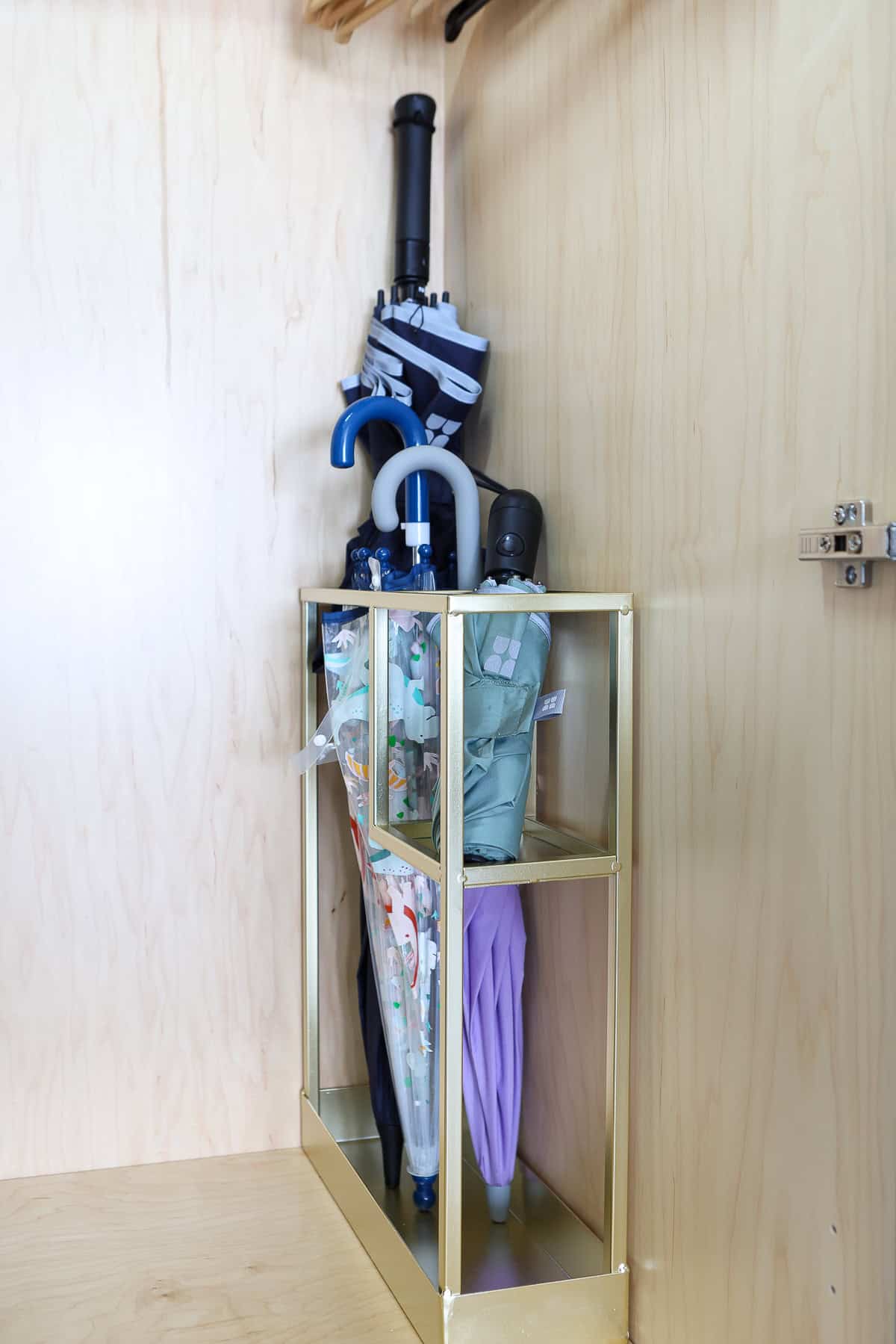 This cabinet also holds one of my favorite little finds: an umbrella holder that works for both tall umbrellas and shorter, collapsible ones. It keeps everything upright and contained instead of dripping onto the floor.