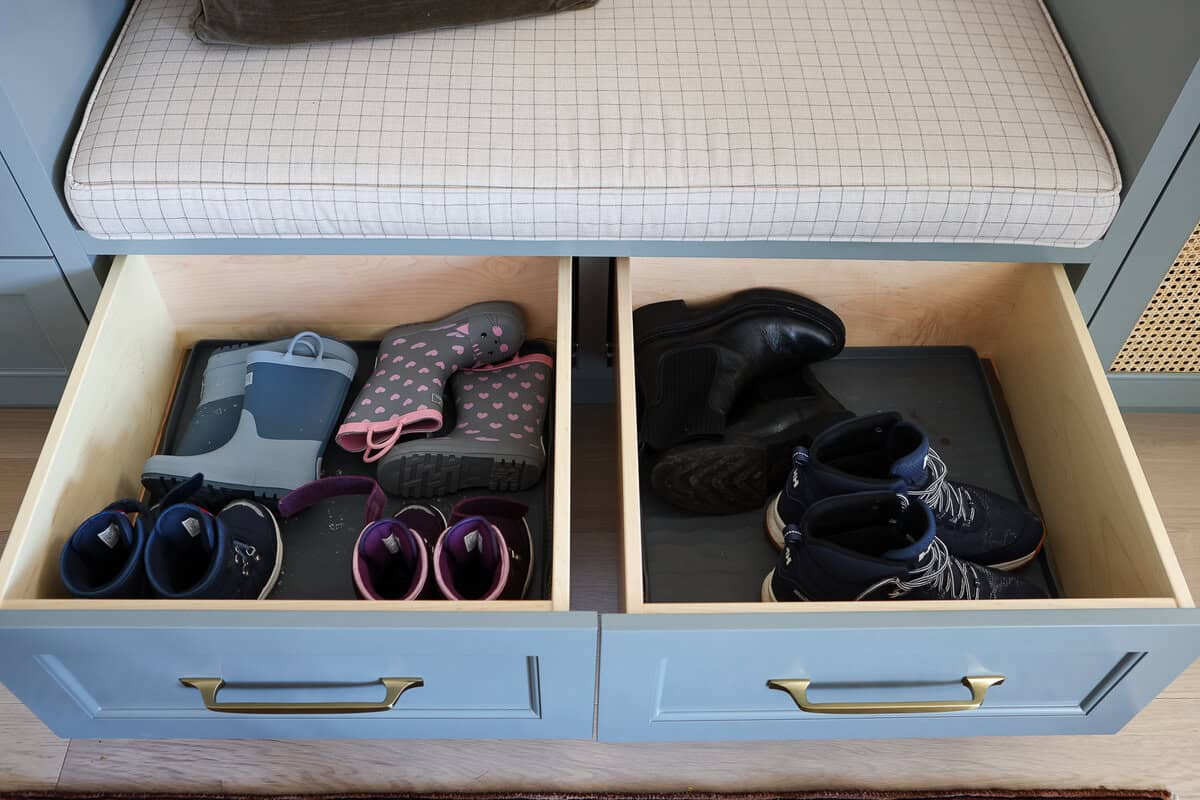 Under the mudroom bench, we added two deep drawers for boots. These have honestly been one of the most functional parts of the entire space.