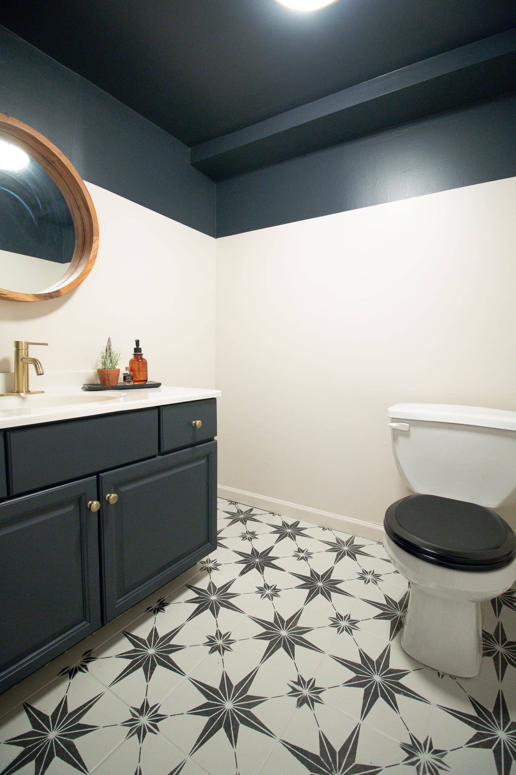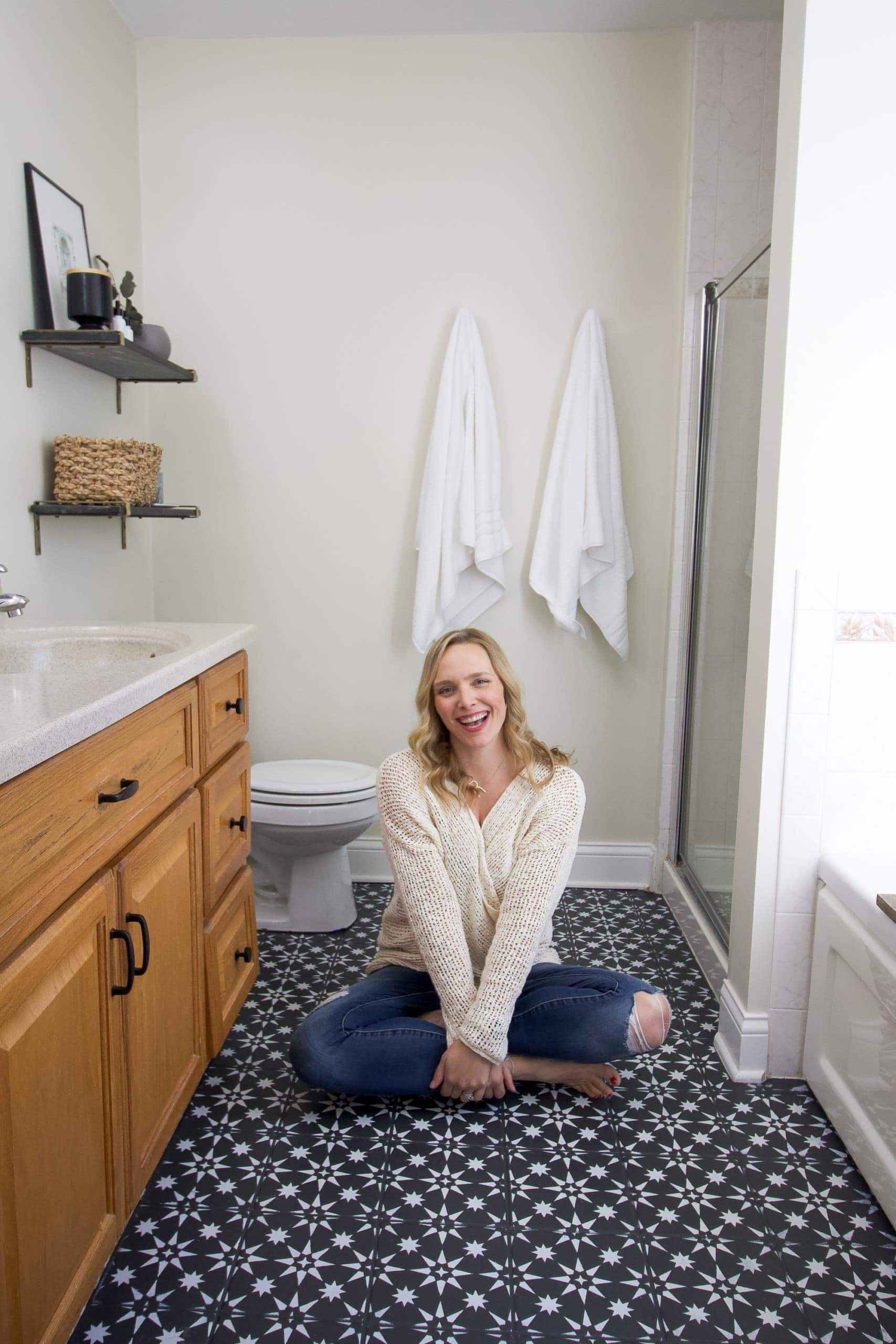 While you’re at it, you can also paint your bathroom tiles. We had generic white tiles in all three of our bathrooms and I painted all of them with fun stencils, colors, and patterns. These were such fun DIY projects and are incredibly budget-friendly.