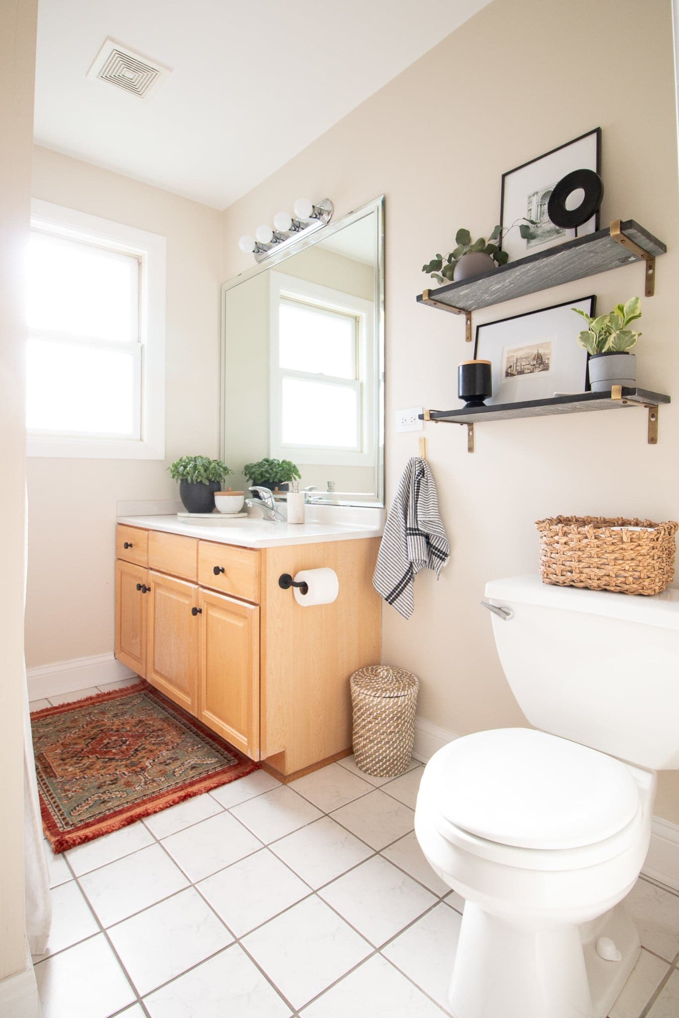 If you don’t love the tile, hardwood floors, or carpet in your home, the best thing you can do is find area rugs that you love! I have a rug in pretty much every single room in our house. They add texture, color, and pattern to a space. Adding the right rug can make a huge difference in your home.