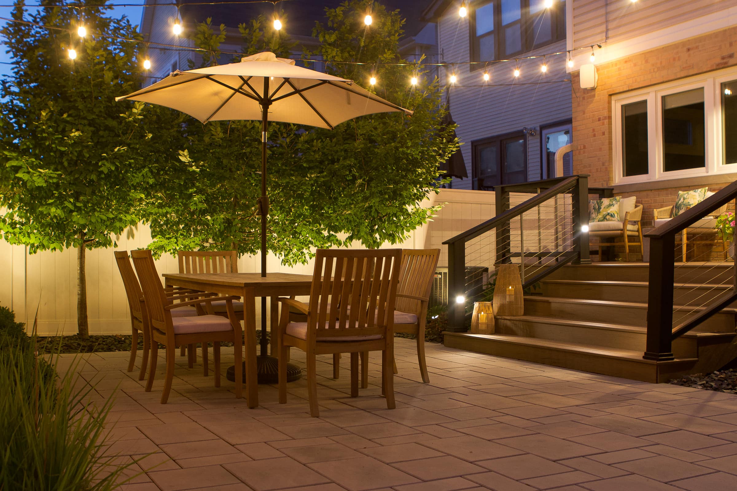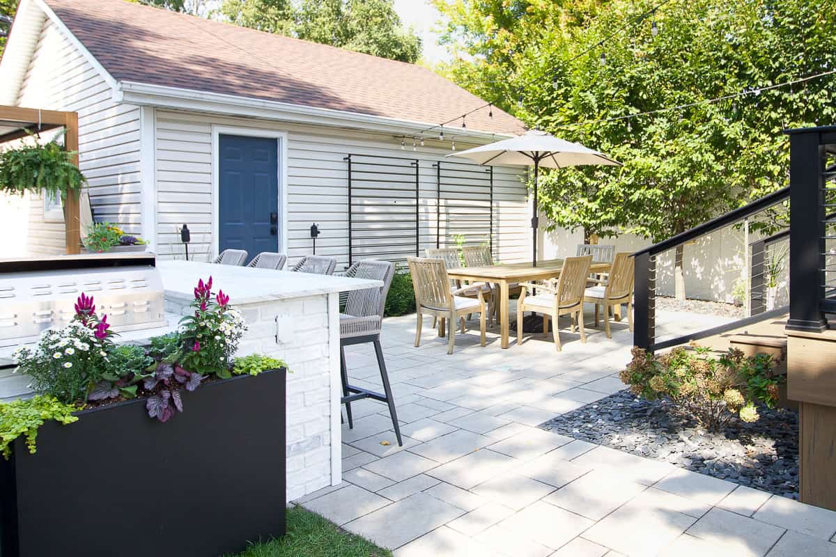 During the summer of 2021, we did a full backyard renovation to take advantage of this space. We added a new deck, added stone pavers, and created a dining and lounging zone out here. We kept the grass in the side yard (good for the kiddos to play), but then took advantage of that backyard space.