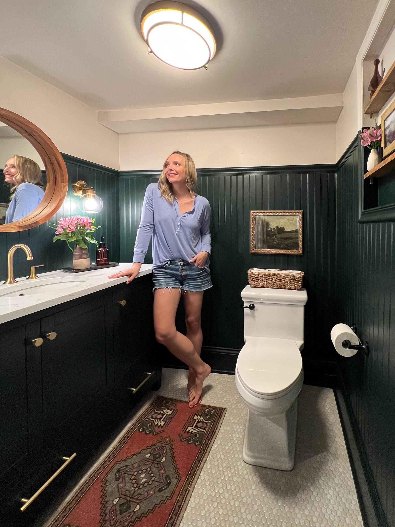 In spring 2023, I spent a couple of months fully renovating this space from top to bottom. I gutted it myself, installed penny tile floors, added beadboard to the walls, and painted the space a rich, moody green.
