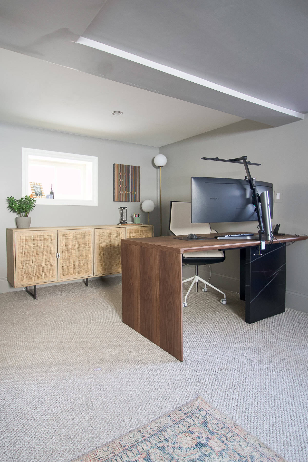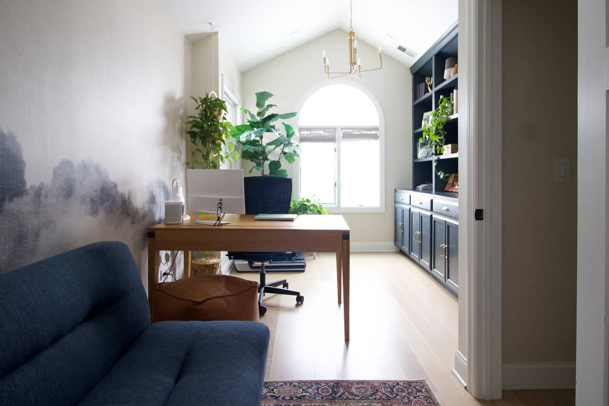 This room sat empty until winter 2020 when we tackled our biggest DIY project yetโcustom built-ins! I also added a wall mural and new furniture, turning it into a stylish and functional workspace that I use every single day!