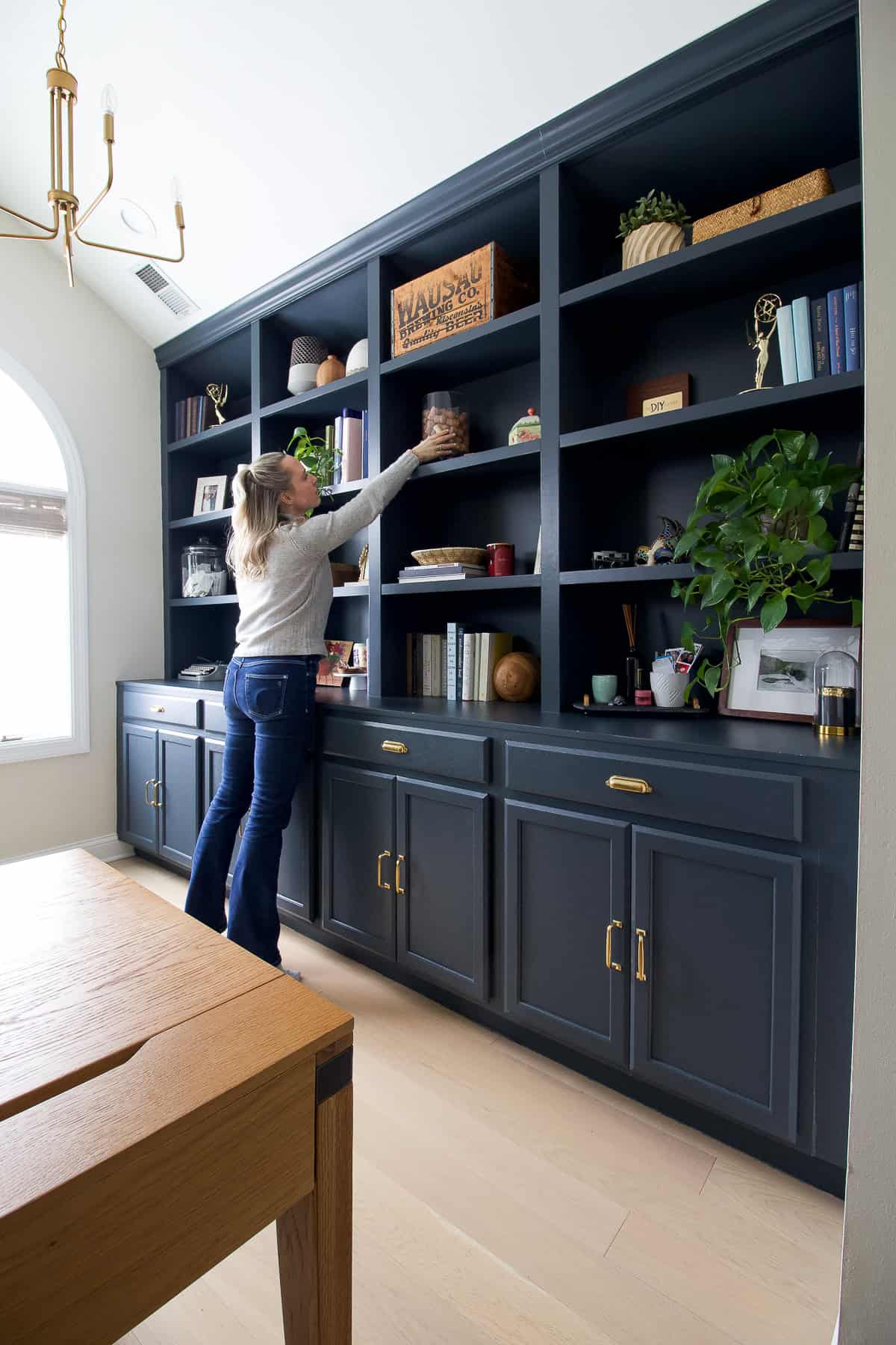 Paint Colors: Benjamin Moore โBallet Whiteโ (walls); Valspar โChimney Smokeโ (built-ins) // DIY Built-Ins // Home Office Reveal // DIY Office Closet