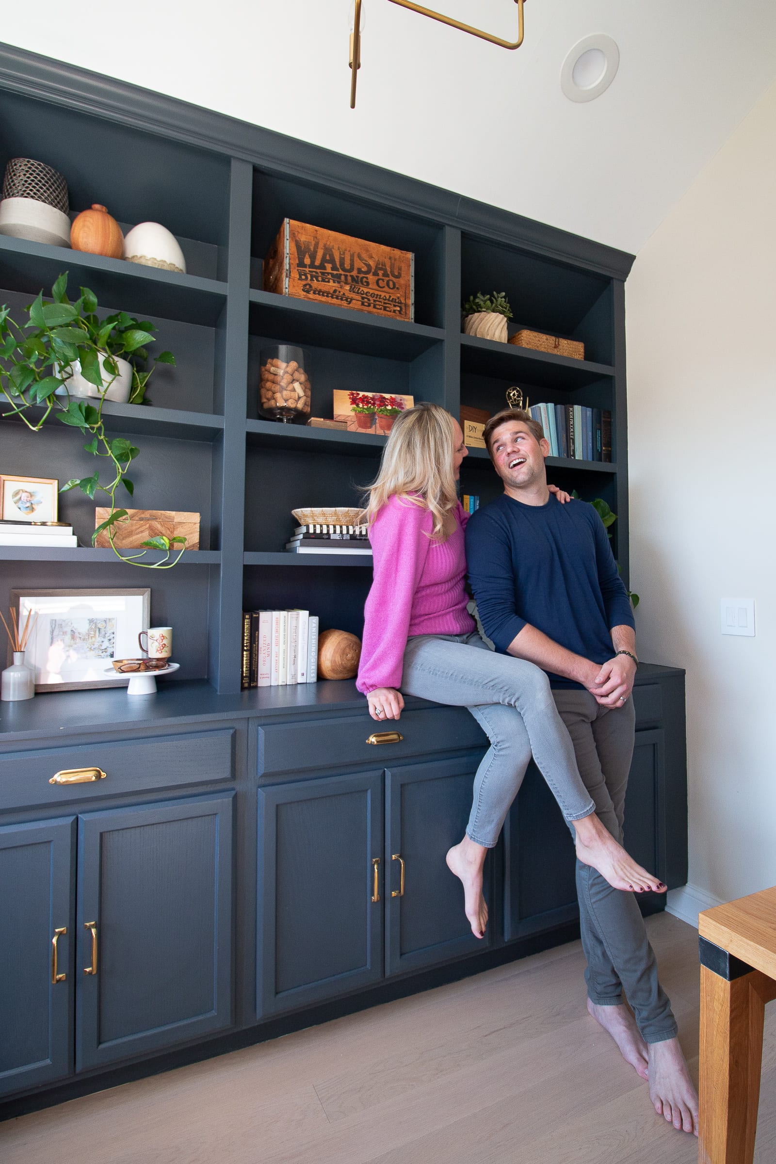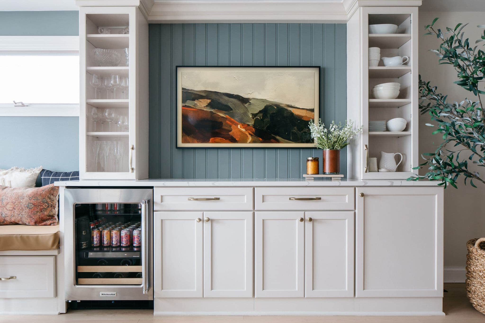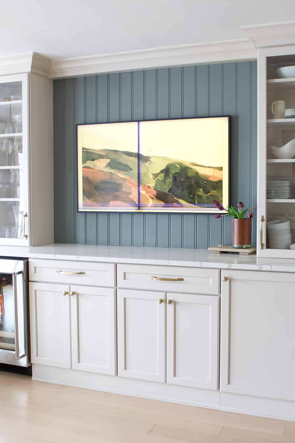 Honestly, we rarely turn it on, and I feel like itโs just a big eyesore now. Iโm open to ideas for this space between our cabinets! Maybe a lamp and shelves? Or a large piece of art with a picture light? Weโll see!