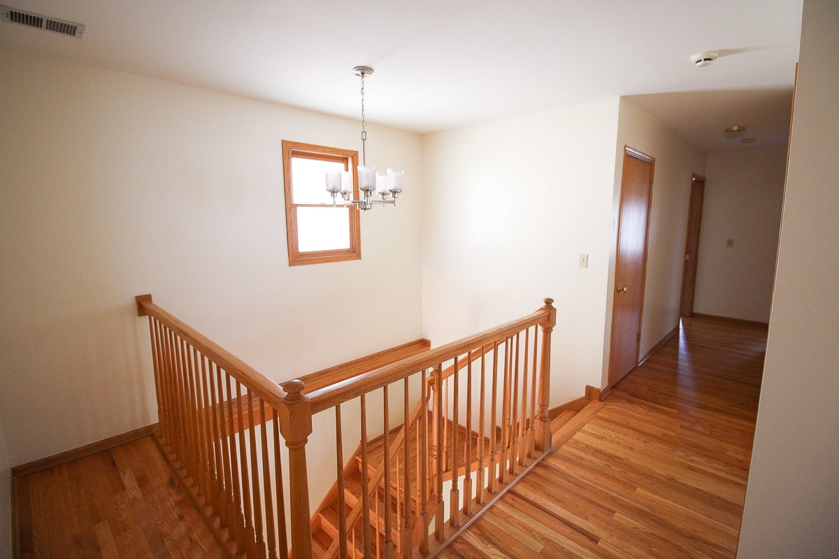 Paint Color: Benjamin Moore โBallet Whiteโ (walls) & โSimply Whiteโ (trim) // Chandelier // Hardwoods // DIY Stair Runner // Railings // Stairwell Accent Wall