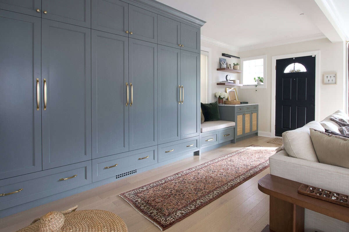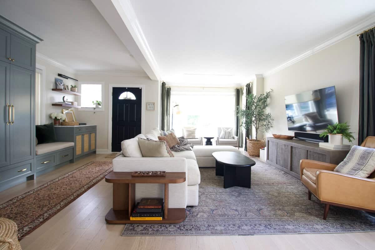 We made big changes in this space right away, tearing down a wall and replacing it with a ginormous steel beam. It was quite the saga (with plenty of permitting headaches), but in the end, we gained a much larger and more functional living room! In 2025, we added a mudroom in the entryway for additional storage and style.